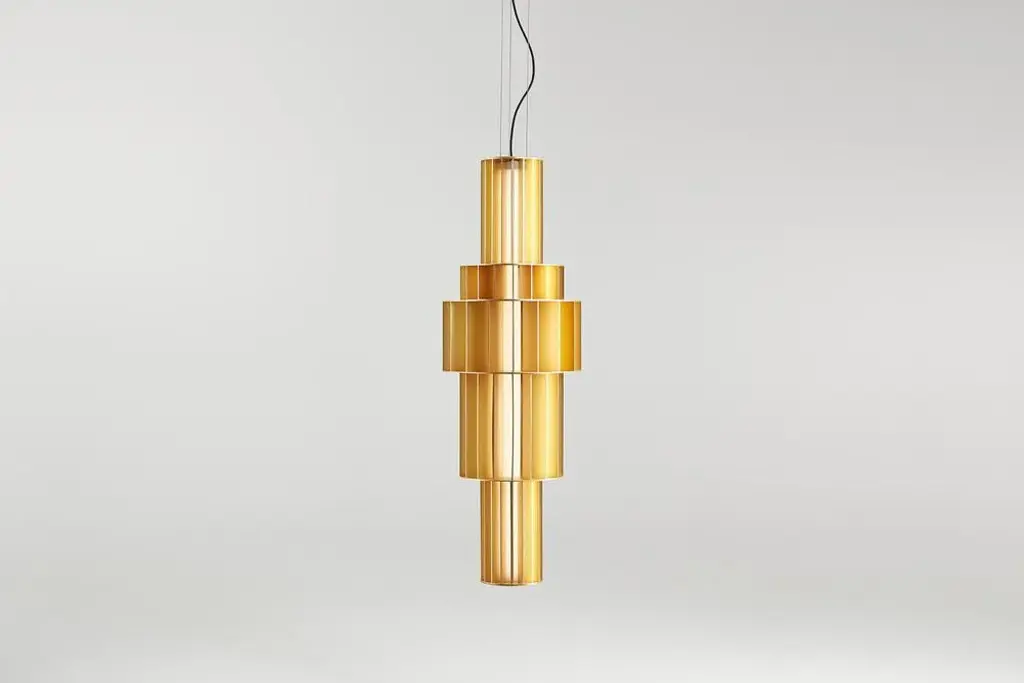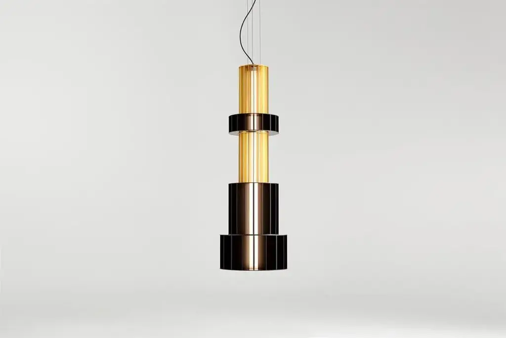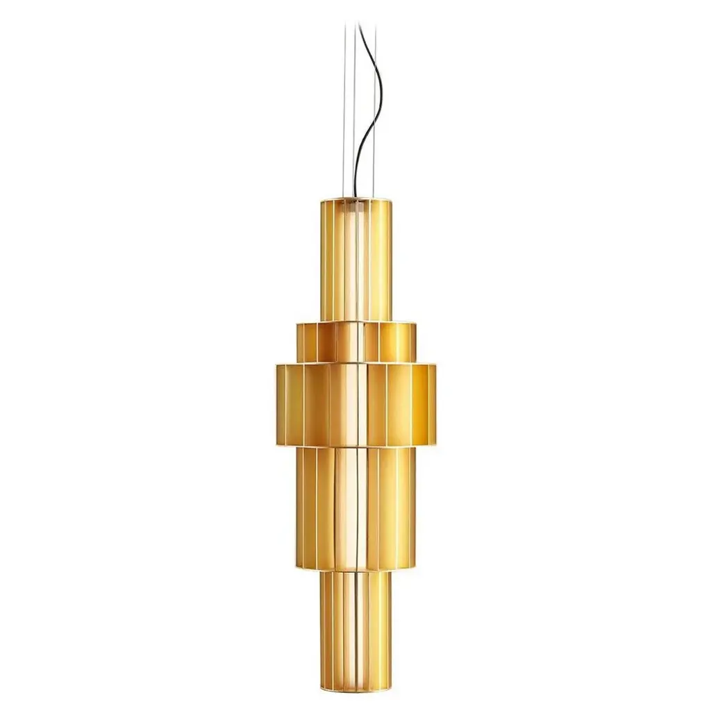 Golden babel t gr pendant lamp by parachilna dimensions: d 40 x h 120 cm. Materials: aluminum structure. Weight: 20.8 kg suspended lamp built using aluminum structures of different heights and diameters. Structures and colors can be combined randomly creating totem-like figures. up to 250v (europe/uk standard).