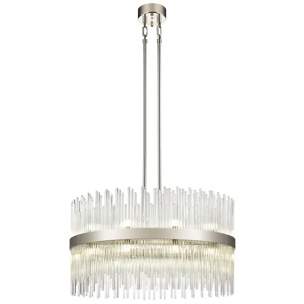 Stunning and dramatic, Ciara is a clean, contemporary design. Like sheets of ice, panels of Hammered Water Glass hang from wide metal hoops. The glass pieces form a layered drum shade enclosing the inner lamps. The diffused light allows admirers to experience the beauty of transparent glass without blinding glare.Features:Dimensions:Electrical Specifications: