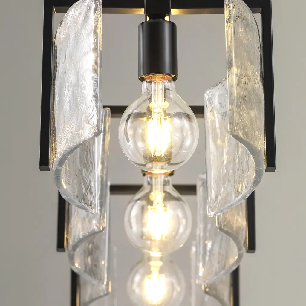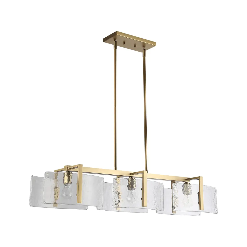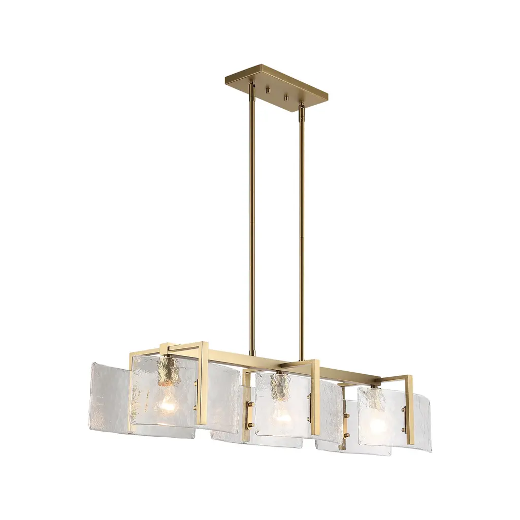 Aenon's universal style positions the series as a contemporary design perfect for transitional to modern homes. The striking Hammered Water Glass draws the eye and quickly becomes a topic of conversation and admiration. Strong masculine steel arms cradle Aenon's unique glass panels, suspending them mid-air. When lit, the Hammered Water Glass contrasts the contemporary finishes and reflect the bright light. Choose between multiple fixture types and finish options.Features:Dimensions:Electrical Specifications: