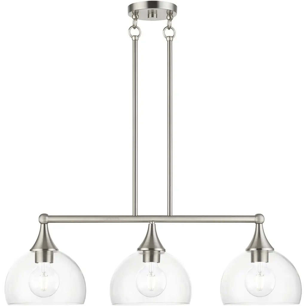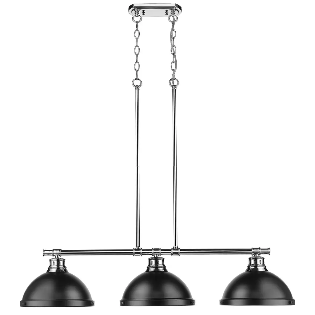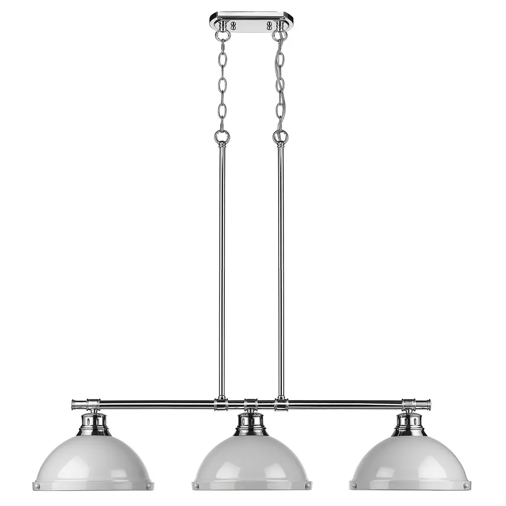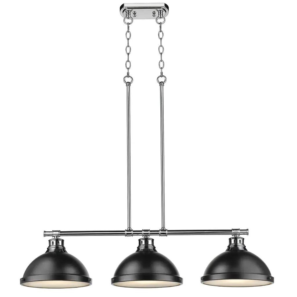 The Duncan collection is contemporary style with an industrial feel. The collection features a variety of simple, traditional silhouettes that are a nod to a bygone era. Transform the look of your room with these classic, vintage-inspired fixtures. A variety of plated and painted metal shade finishes are offered in choice combinations. This 3-light linear pendant features frosted glass diffusers for warm task lighting over a bar or nook.Features:Dimensions:Electrical Specifications: