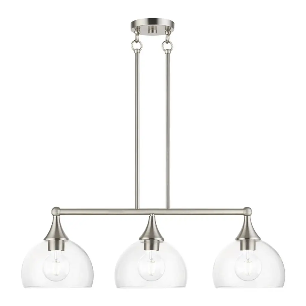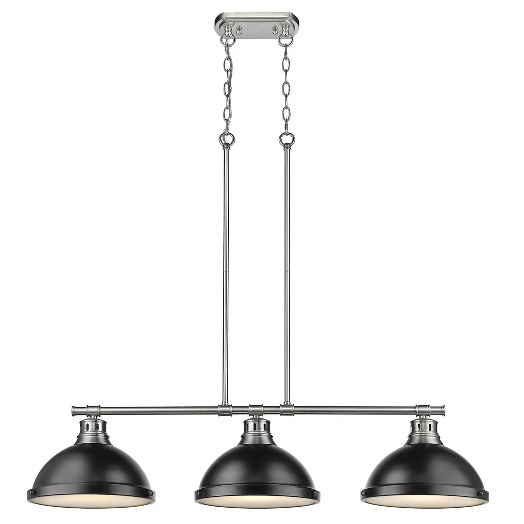 The Duncan collection is contemporary style with an industrial feel. The collection features a variety of simple, traditional silhouettes that are a nod to a bygone era. Transform the look of your room with these classic, vintage-inspired fixtures. A variety of plated and painted metal shade finishes are offered in choice combinations. This 3-light linear pendant features frosted glass diffusers for warm task lighting over a bar or nook.Features:Dimensions:Electrical Specifications: