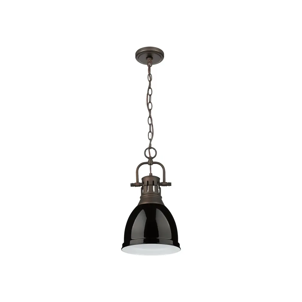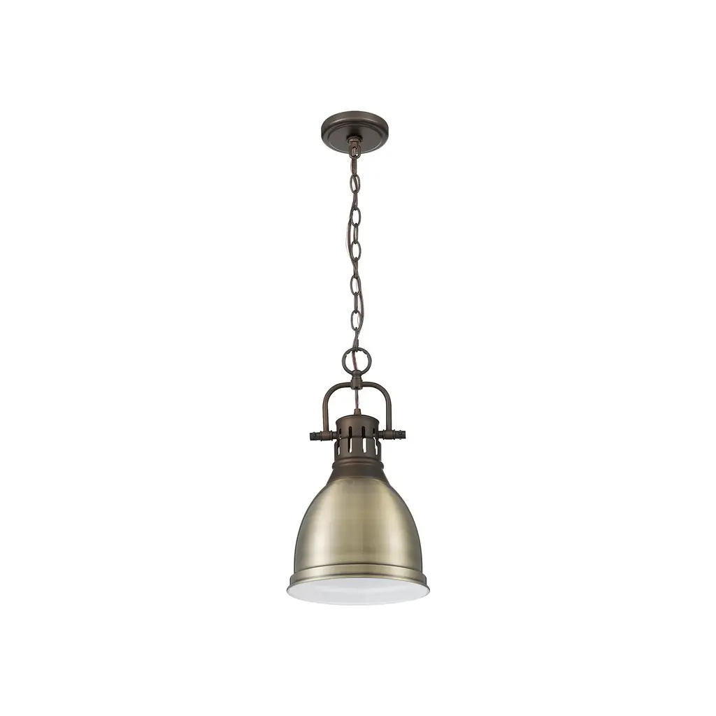 The Duncan collection is contemporary style with an industrial feel. The collection features a variety of simple, traditional silhouettes that are a nod to a bygone era. Transform the look of your room with these classic, vintage-inspired fixtures. A variety of plated and painted metal shade finishes are offered in choice combinations. This small, chain-hung pendant features a may be hung individually or grouped over a bar.Features:Dimensions:Electrical Specifications: