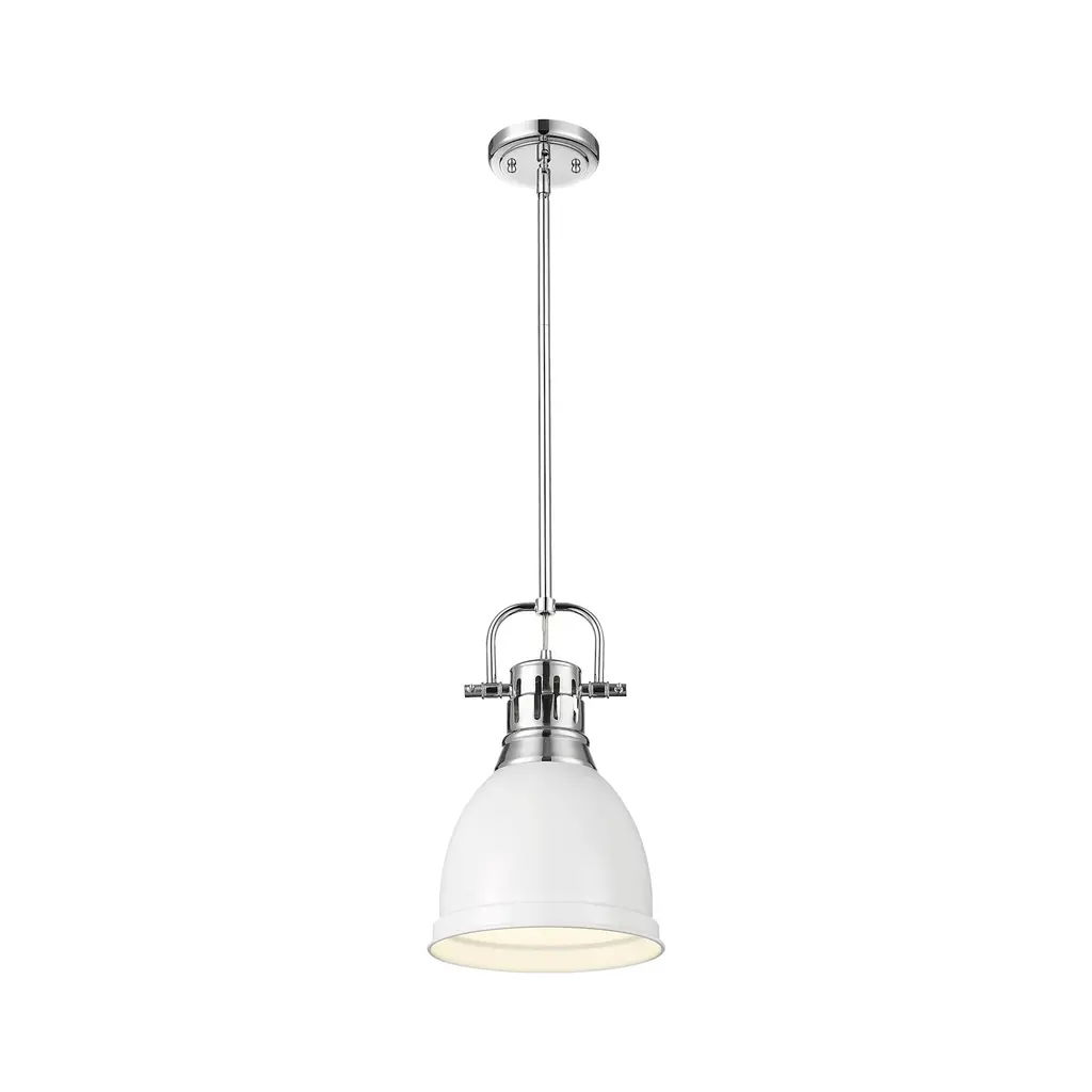 The Duncan collection is contemporary style with an industrial feel. The collection features a variety of simple, traditional silhouettes that are a nod to a bygone era. Transform the look of your room with these classic, vintage-inspired fixtures. A variety of plated and painted metal shade finishes are offered in choice combinations. This small, rod-hung pendant features a may be hung individually or grouped over a bar.Features:Dimensions:Electrical Specifications: