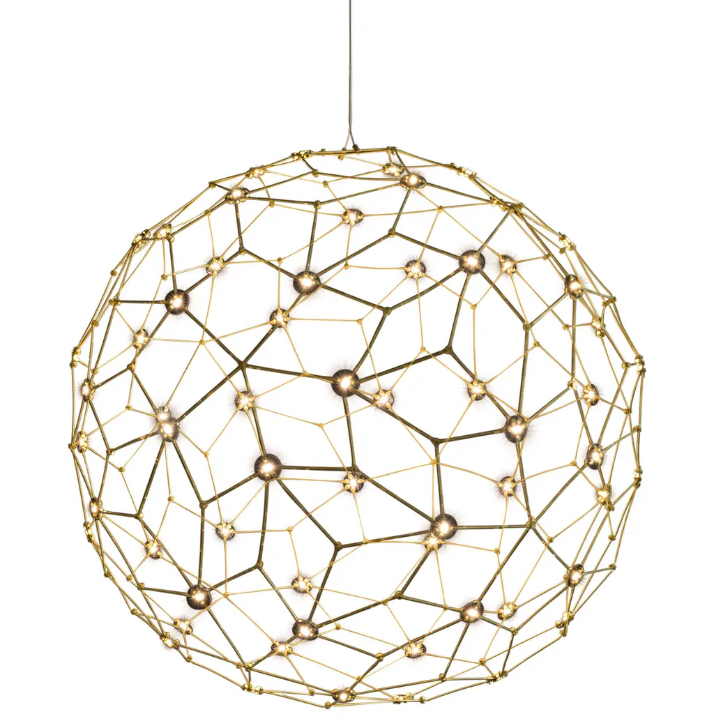 Introducing Spheris, a breathtaking fusion of artistry and light that transforms any space into a celestial masterpiece. Crafted from natural brass, this enchanting fixture features a hairpin geometric design that forms a mesmerizing spherical shape, evoking the beauty of a constellation suspended in the night sky. When illuminated, Spheris comes to life, casting intricate patterns of light and shadow that dance across your walls and ceiling, creating a dynamic and magical ambiance. Each of its 60 light points emits a radiant glow, delivering bright, even illumination that feels both sophisticated and otherworldly.Features:Dimensions:Electrical Specifications: