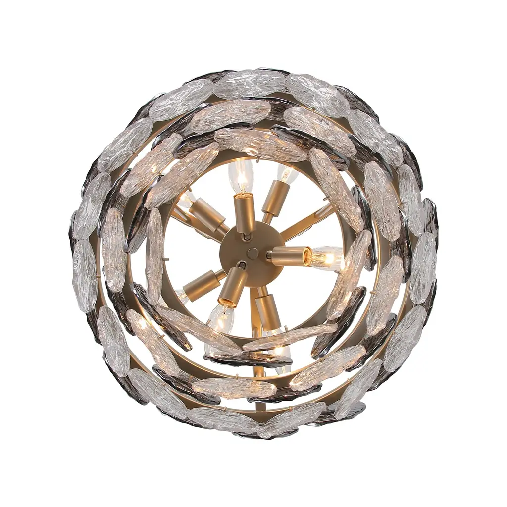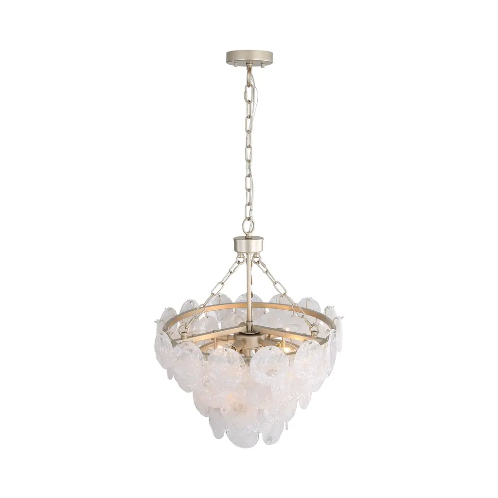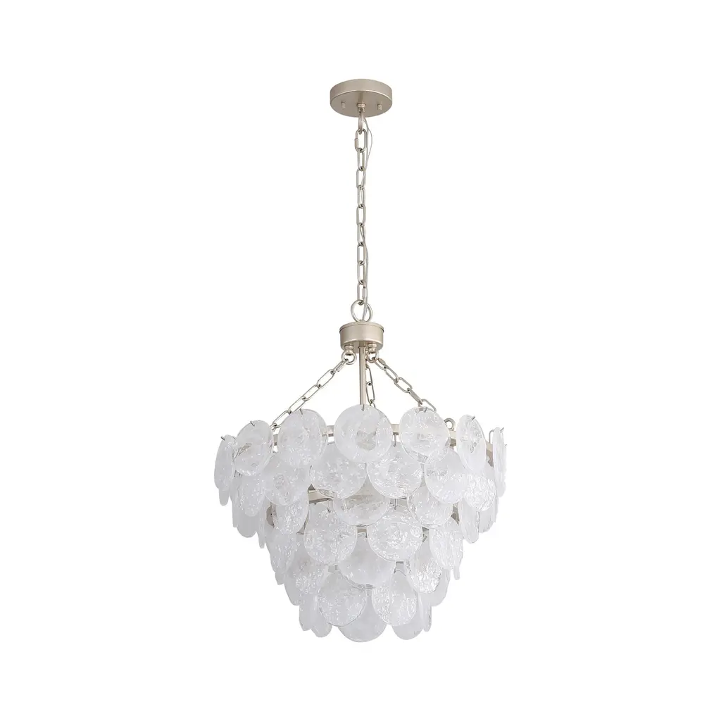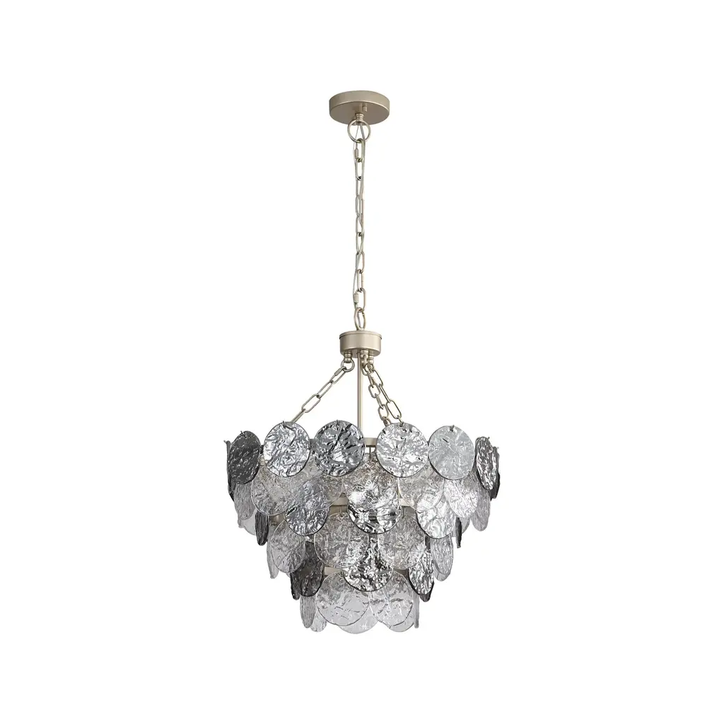 Transform your space into a haven of elegance and charm with Cascada, a breathtaking lighting fixture that captures the serene beauty of cascading water. Featuring shimmering tiers adorned with stunning clear, hammered glass circles, Cascada radiates a mesmerizing play of light and color. As the light filters through each glass disc, it creates a warm, romantic glow that envelops your room in a truly enchanting ambiance. At the heart of Cascada is Golden Lighting’s signature hammered water glass, a texture that adds depth and dimension to its design. The classic empire silhouette blends timeless sophistication with modern artistry, while the fixture’s intentionally concealed frame ensures that the shimmering glass remains the star of the show.Features:Dimensions:Electrical Specifications: