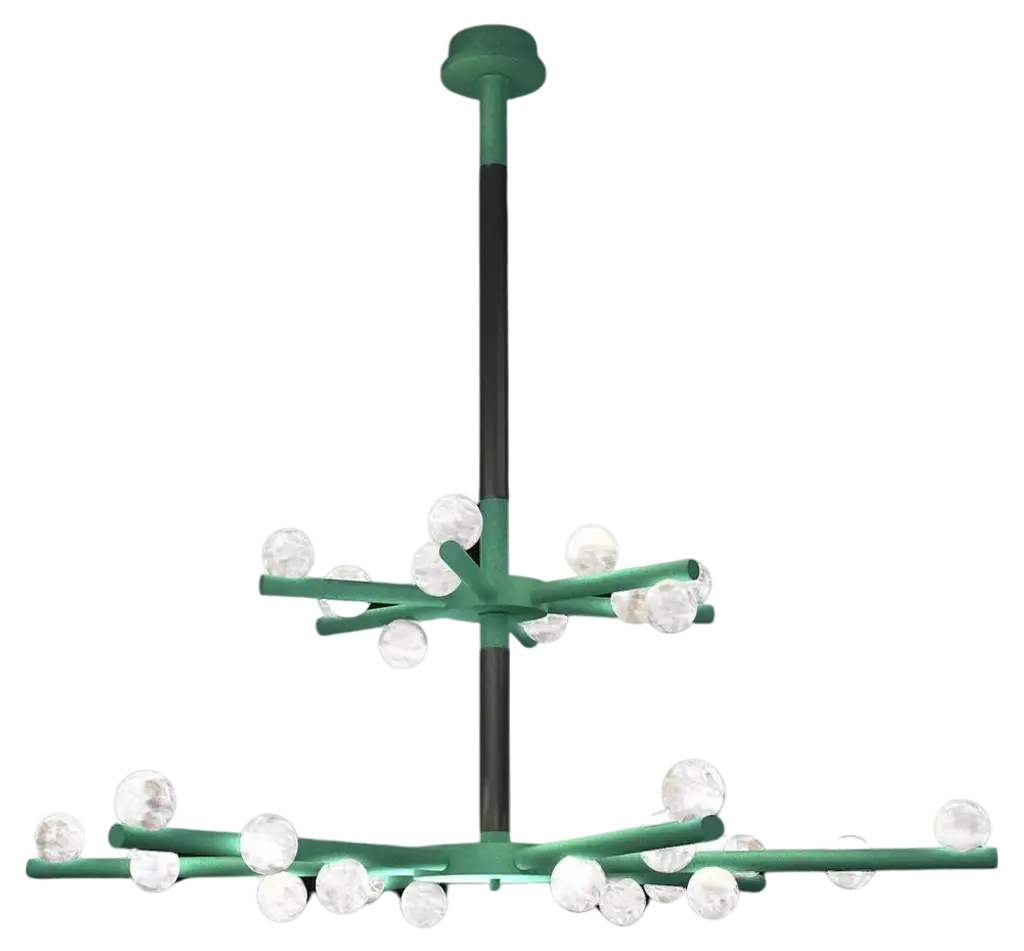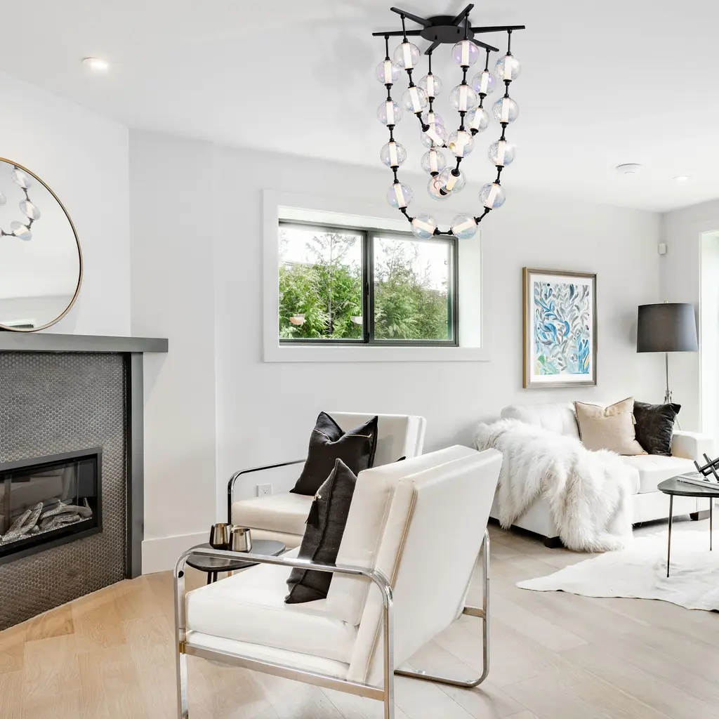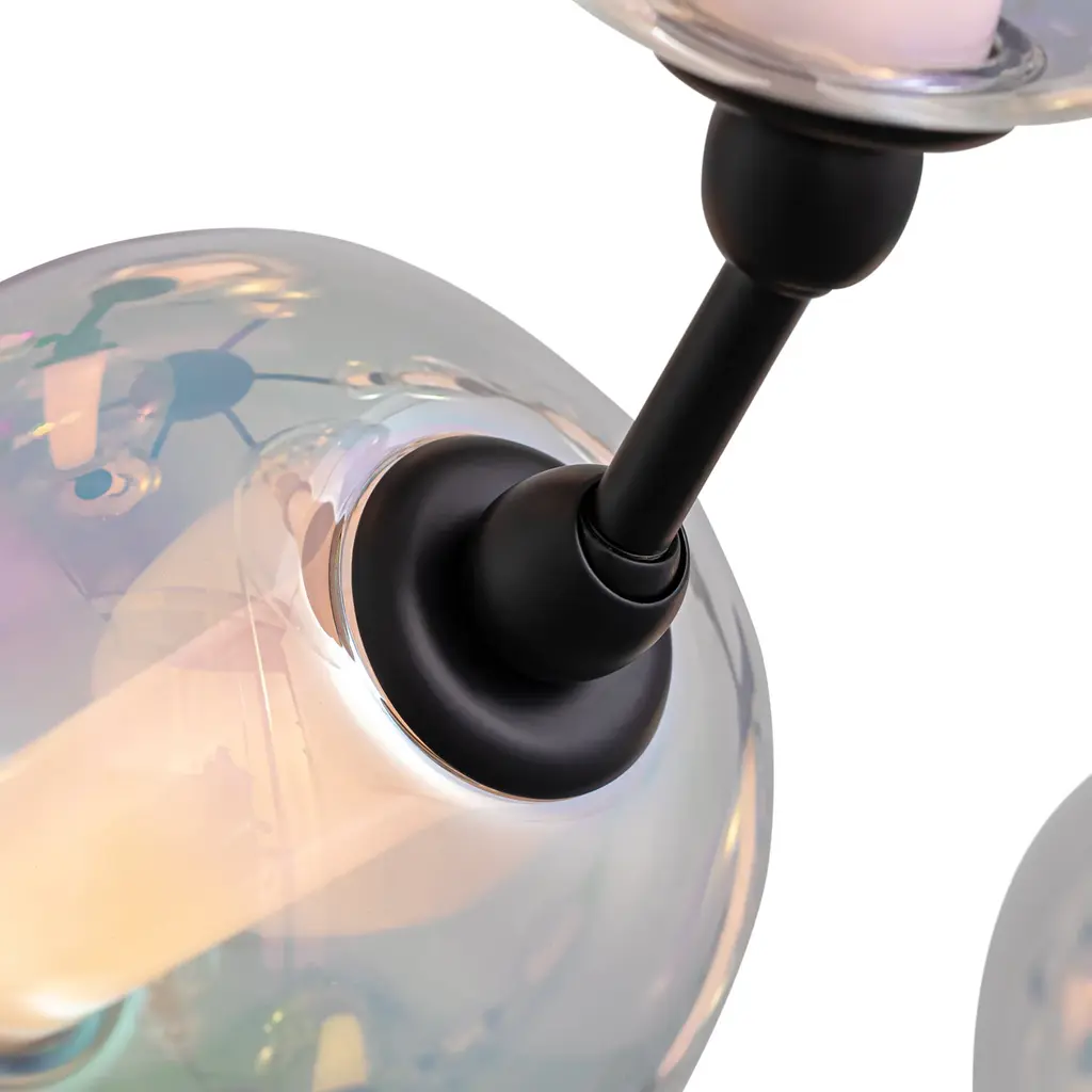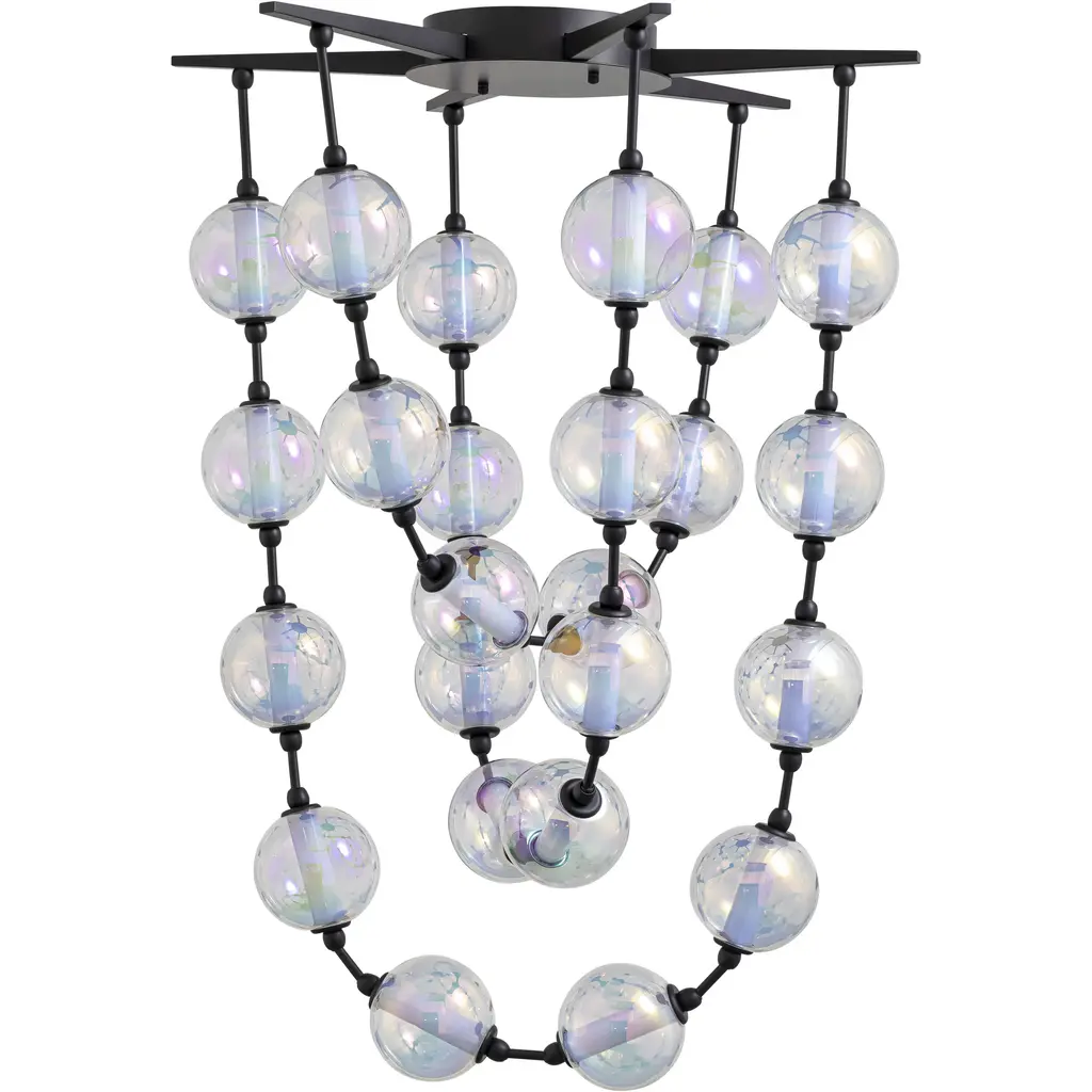 Elevate your space with the enchanting beauty of Perla, a lighting fixture inspired by the timeless elegance of a pearl necklace. Each iridescent bulb emits a soft, mesmerizing glow, casting a rainbow-like illumination that dances gracefully across your room. The unique finish of the bulbs captures and reflects light, creating a dynamic and ever-changing visual effect that captivates the eye. Perla is more than just a light; it’s a statement of sophisticated charm and modern glamour. The striking starburst canopy adds a touch of contemporary elegance. Crafted with both beauty and functionality in mind, each bulb in Perla connects individually, allowing for effortless replacement when needed. This modular design ensures your fixture remains flawless and functional for years to come. Built to last with high-quality materials, Perla is as durable as it is stunning.Features:Dimensions:Electrical Specifications: