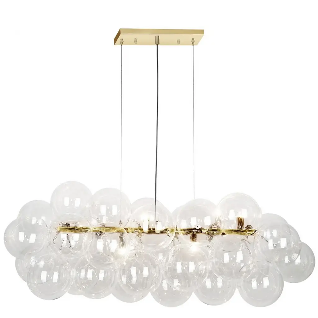 Elevate your space with the enchanting beauty of Perla, a lighting fixture inspired by the timeless elegance of a pearl necklace. Each iridescent bulb emits a soft, mesmerizing glow, casting a rainbow-like illumination that dances gracefully across your room. The unique finish of the bulbs captures and reflects light, creating a dynamic and ever-changing visual effect that captivates the eye. Perla is more than just a light; it’s a statement of sophisticated charm and modern glamour. The striking starburst canopy adds a touch of contemporary elegance. Crafted with both beauty and functionality in mind, each bulb in Perla connects individually, allowing for effortless replacement when needed. This modular design ensures your fixture remains flawless and functional for years to come. Built to last with high-quality materials, Perla is as durable as it is stunning.Features:Dimensions:Electrical Specifications: