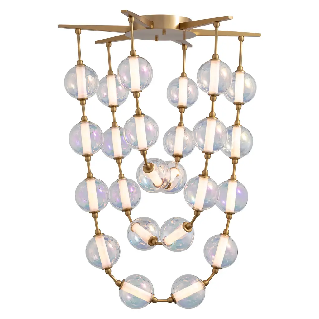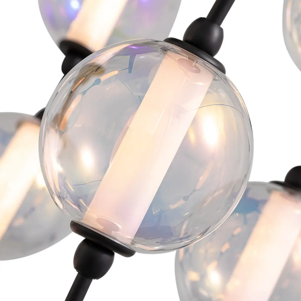 Elevate your space with the enchanting beauty of Perla, a lighting fixture inspired by the timeless elegance of a pearl necklace. Each iridescent bulb emits a soft, mesmerizing glow, casting a rainbow-like illumination that dances gracefully across your room. The unique finish of the bulbs captures and reflects light, creating a dynamic and ever-changing visual effect that captivates the eye. Perla is more than just a light; it’s a statement of sophisticated charm and modern glamour. The striking starburst canopy adds a touch of contemporary elegance. Crafted with both beauty and functionality in mind, each bulb in Perla connects individually, allowing for effortless replacement when needed. This modular design ensures your fixture remains flawless and functional for years to come. Built to last with high-quality materials, Perla is as durable as it is stunning.Features:Dimensions:Electrical Specifications: