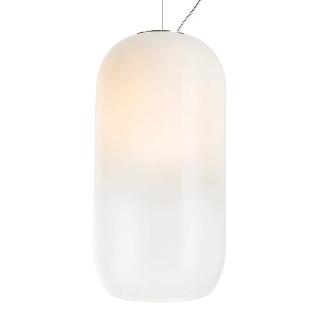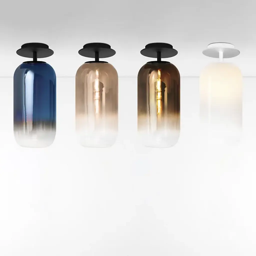A delightful presence of light designed by Bjarke Ingels Group. The Gople Mini Semi-Flushmount from Artemide is a modern piece crafted using the same tried and true glass-blowing techniques established centuries ago in Venice. Each shade comes from master artisans in Murano, Venice. Glassblowers fill up molten glass with their breath and shape it by hand into an enchanting pill-shaped form. A glaze of seductive color paints across the shade; its composition is made from environmentally friendly materials. Light embraced by the lovely shade filters gently out in a warm, diffused glow.