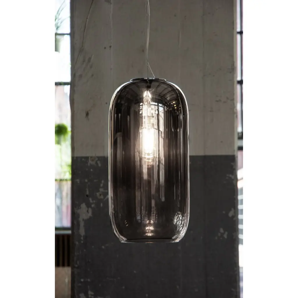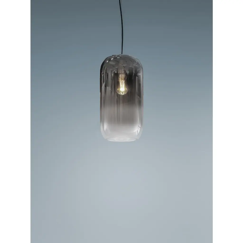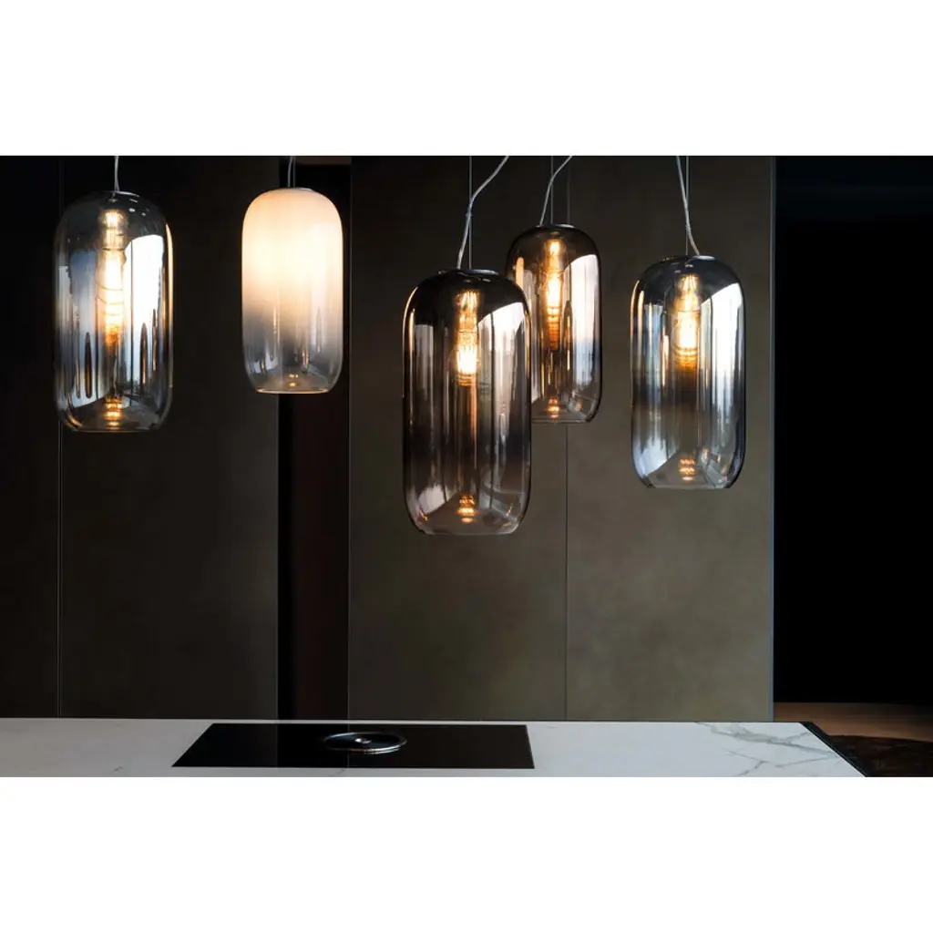 The Gople pendant by Artemide fills the space with a softly glowing light that filters through a gradient colored glass shade. Gople hangs on a thin aluminum cable and catches the eye for instance above the dining table or sofa group. Thanks to its narrow design, Gople looks great also in pairs and clusters. The glass shade has been hand-processed with an ancient Venetian technique that makes each lamp a unique piece. Gople was designed by Bjarke Ingels Group.