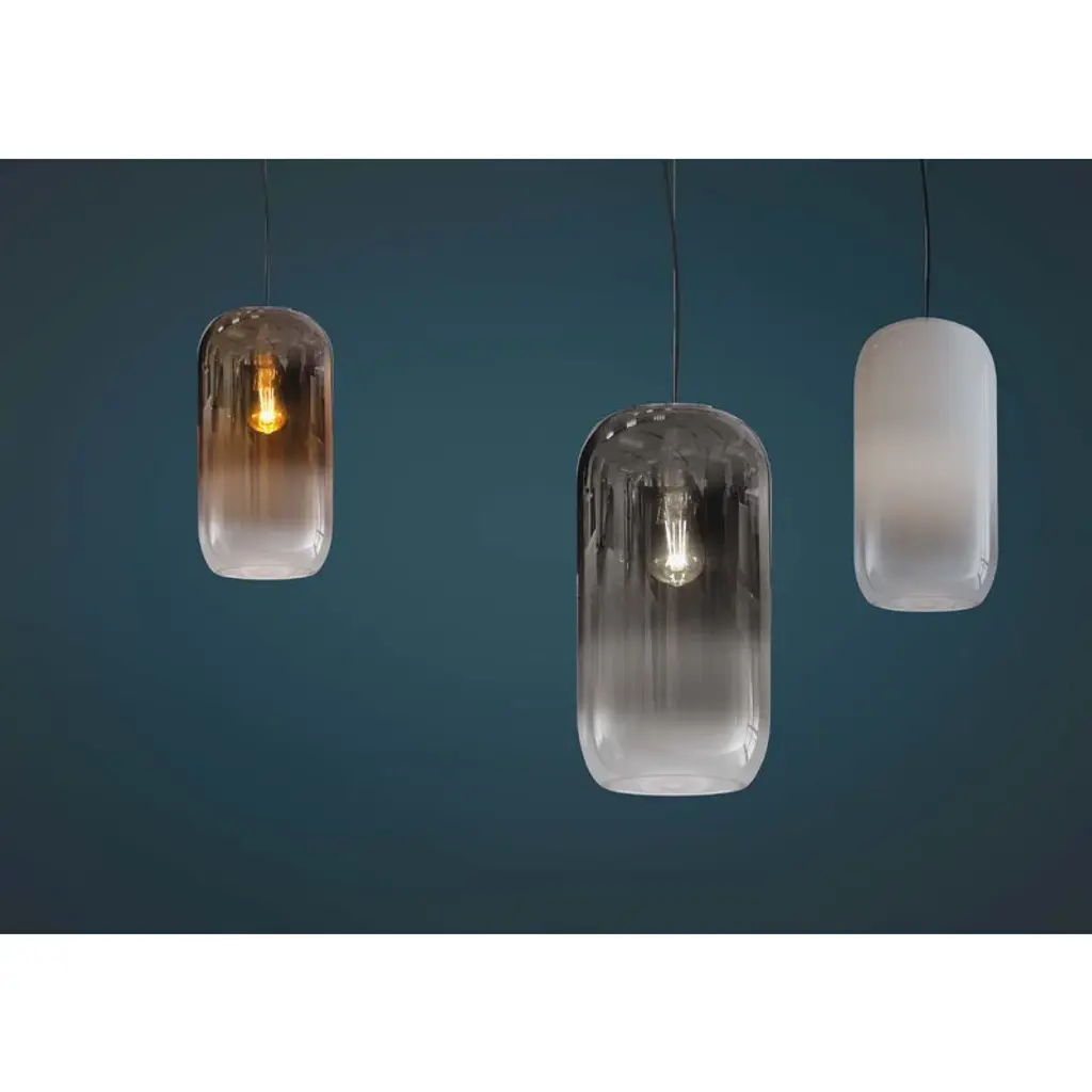 The Gople pendant by Artemide fills the space with a softly glowing light that filters through a gradient colored glass shade. Gople hangs on a thin aluminum cable and catches the eye for instance above the dining table or sofa group. Thanks to its narrow design, Gople looks great also in pairs and clusters. The glass shade has been hand-processed with an ancient Venetian technique that makes each lamp a unique piece. Gople was designed by Bjarke Ingels Group.