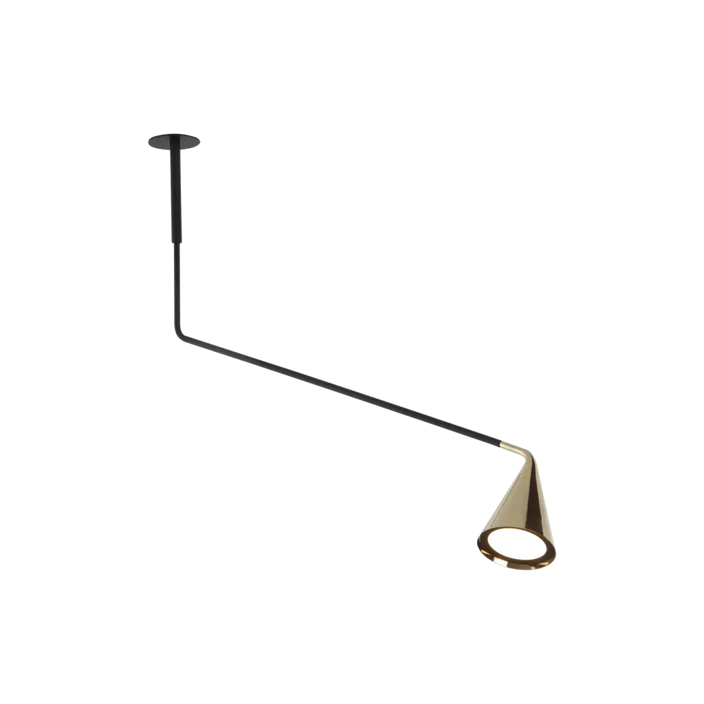 A new formal and material interpretation of the conical diffuser is the main feature of Gordon lamps. The essential and refined aspect with a strong character that is conferred by the shape of the brass casting; these practical and versatile lamps are suitable to be used in different environments. The matte black metal structure complements the black chromatic conical diffuser. The lamp has an 270° adjustable direct light and arm (60 to 75cm).