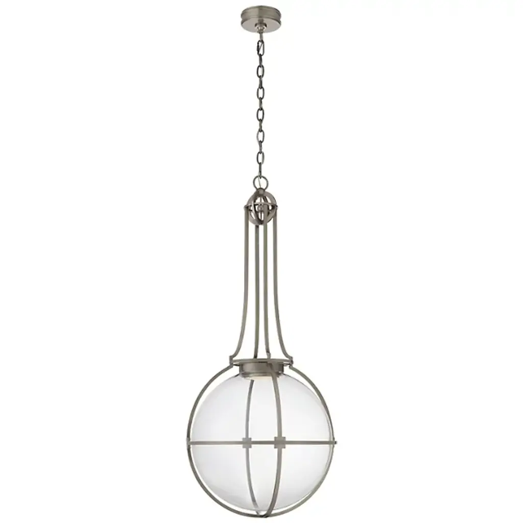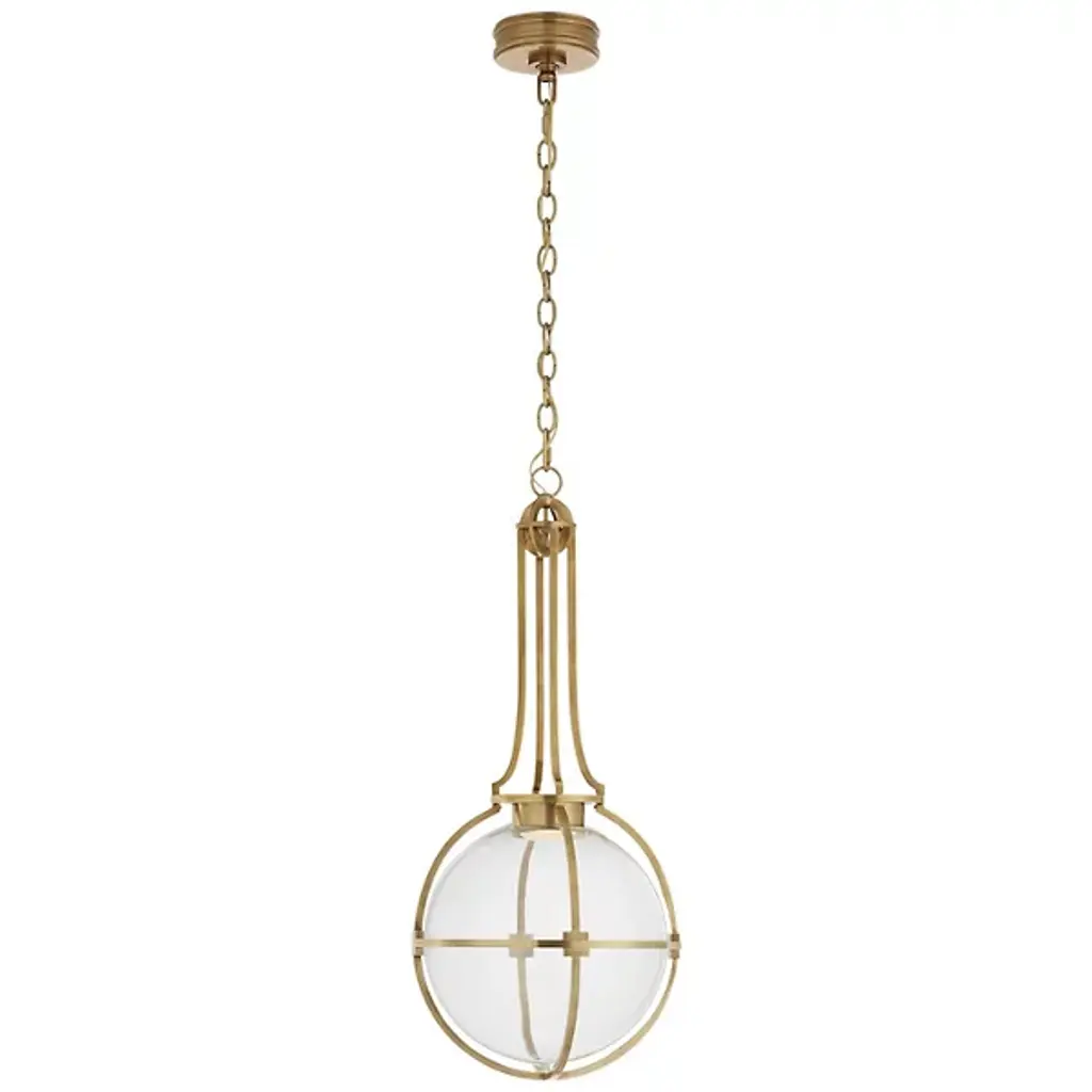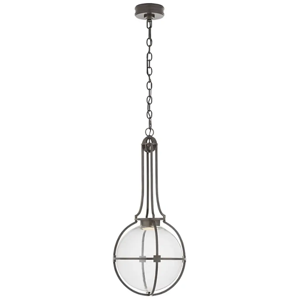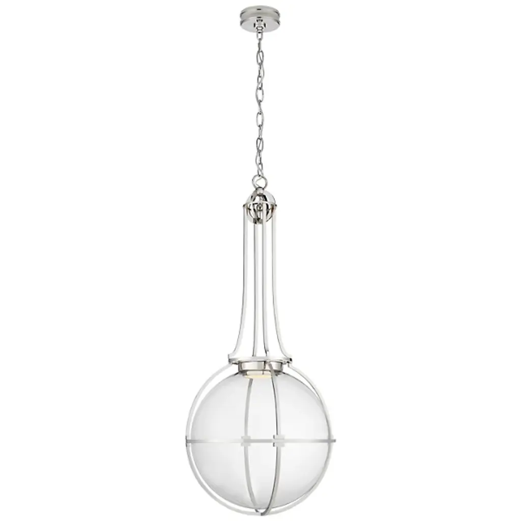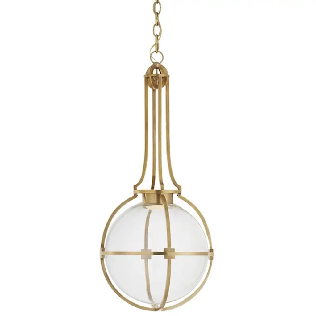Bring a classy, rain-drop silhouette to the heart of your home with the Gracie Globe Pendant from Visual Comfort Signature, formerly known as Visual Comfort, A soothing, spherical piece acts as a central point between a crisp chainlink and four thin, metal arms that delicately flow downward, wrapping around a larger spherical, clear glass shade. The dedicated, energy-efficient LED shines from a cap resting at the top of the sphere, illuminating the fixture with a clean, warm glow.