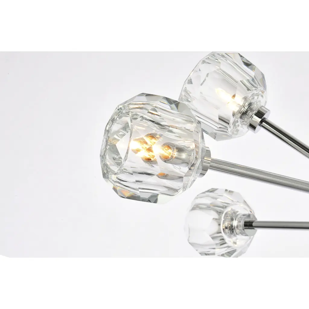 Crafted from iron metal and crystal, it features a round ceiling canopy, a 60 inch hanging chain, and arms extended with a solid K9 crystal ball from rods at all angles for a modern and linear look. Each 20W G9 bulb ( not included) is diffused by a faceted clear crystal ball giving the fixture a touch of industrial and glam inspiration. This work of art will add an artful focal point to your entryway, dining room, kitchen, or office. Evoking a sophisticated and timeless aesthetic to any space and will be an instant conversation started with its finely faceted crystal sphere which is polished by hand to reflect and refract light. Available in three different finishes in gold, chrome, and black.