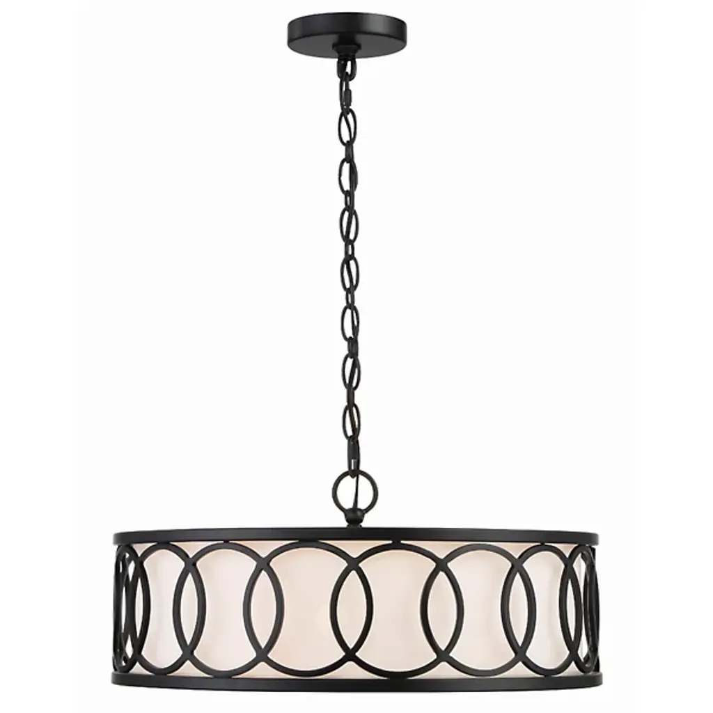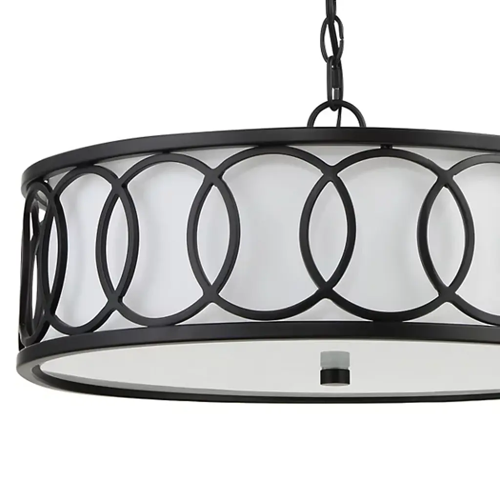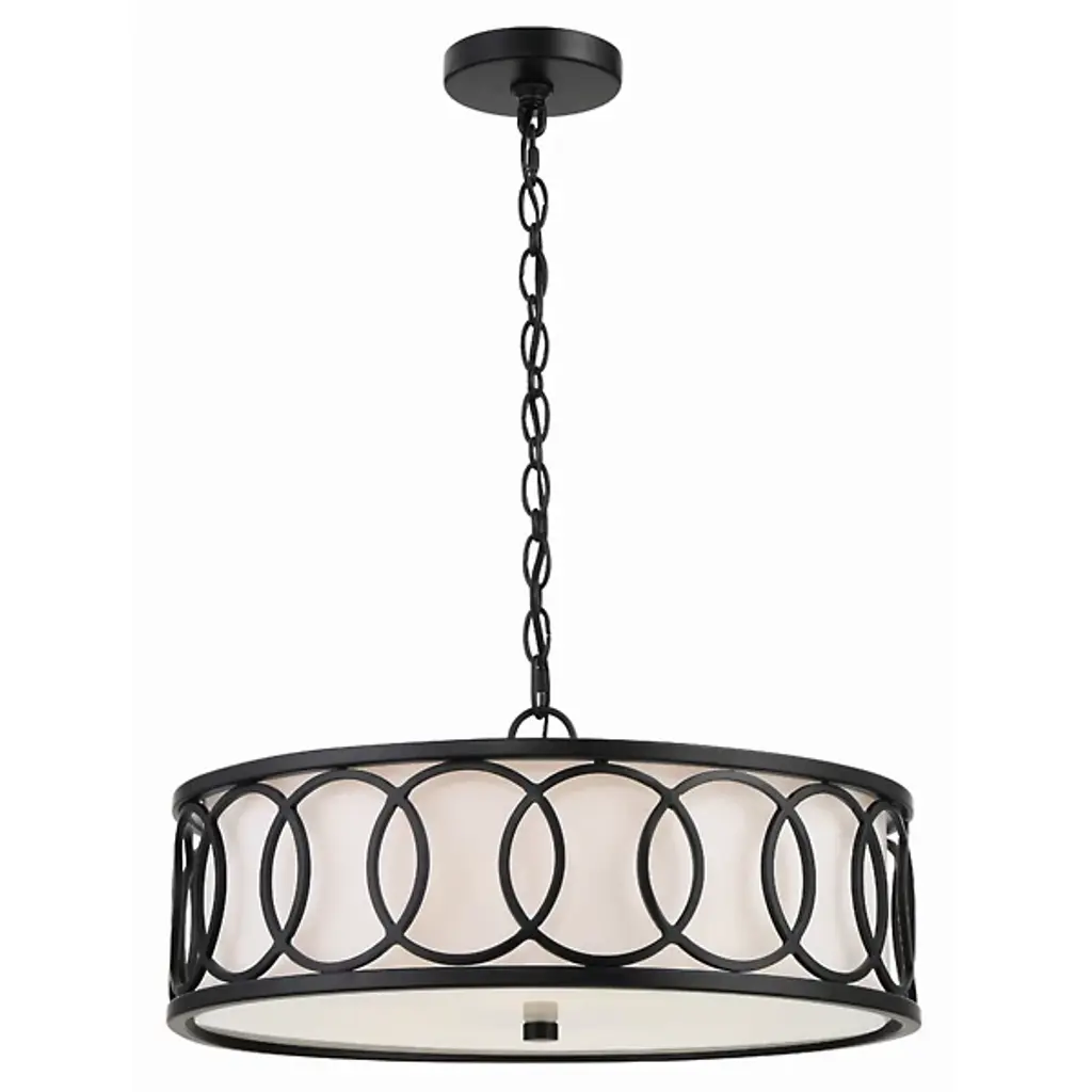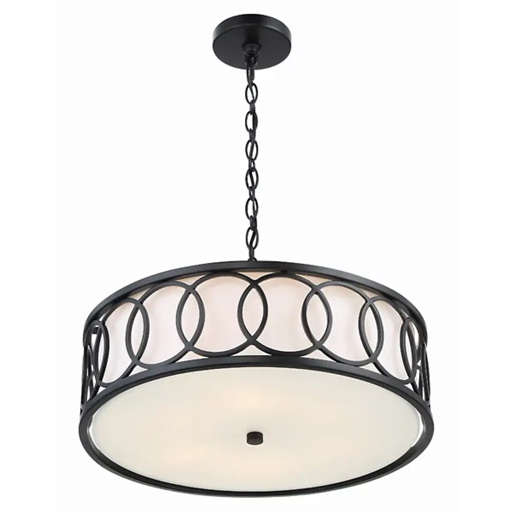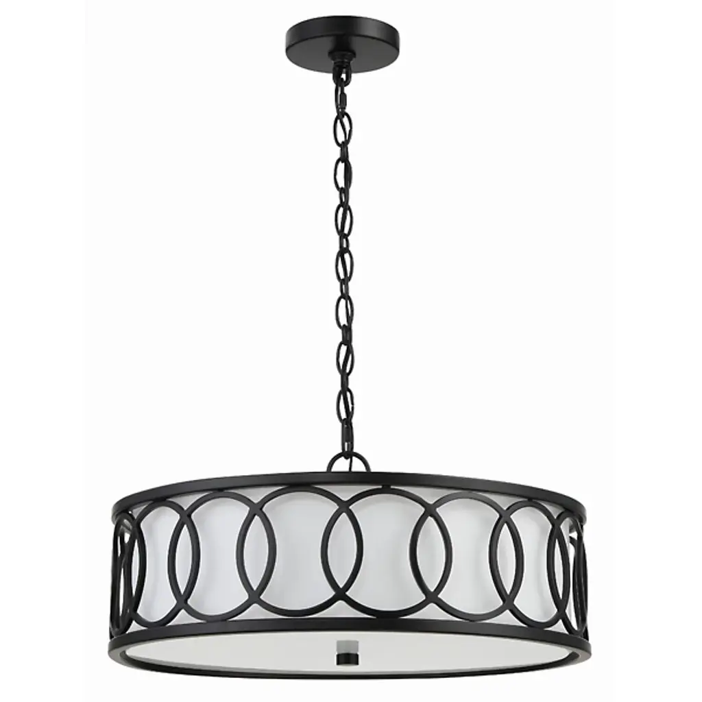 Elevate your dining or living area with the sophisticated Graham Drum Pendant by Crystorama, a charming and unique contemporary fixture designed by Libby Langdon. A round drum shade comprised of robust steel is adorned with a distinctive interlinking open circle framework creating an eye-catching motif. The fabric shade and bottom diffuser soften its warm, ambient light glowing from incandescent bulbs within and enhance the ornate pattern as a chic backdrop for that perfect space.