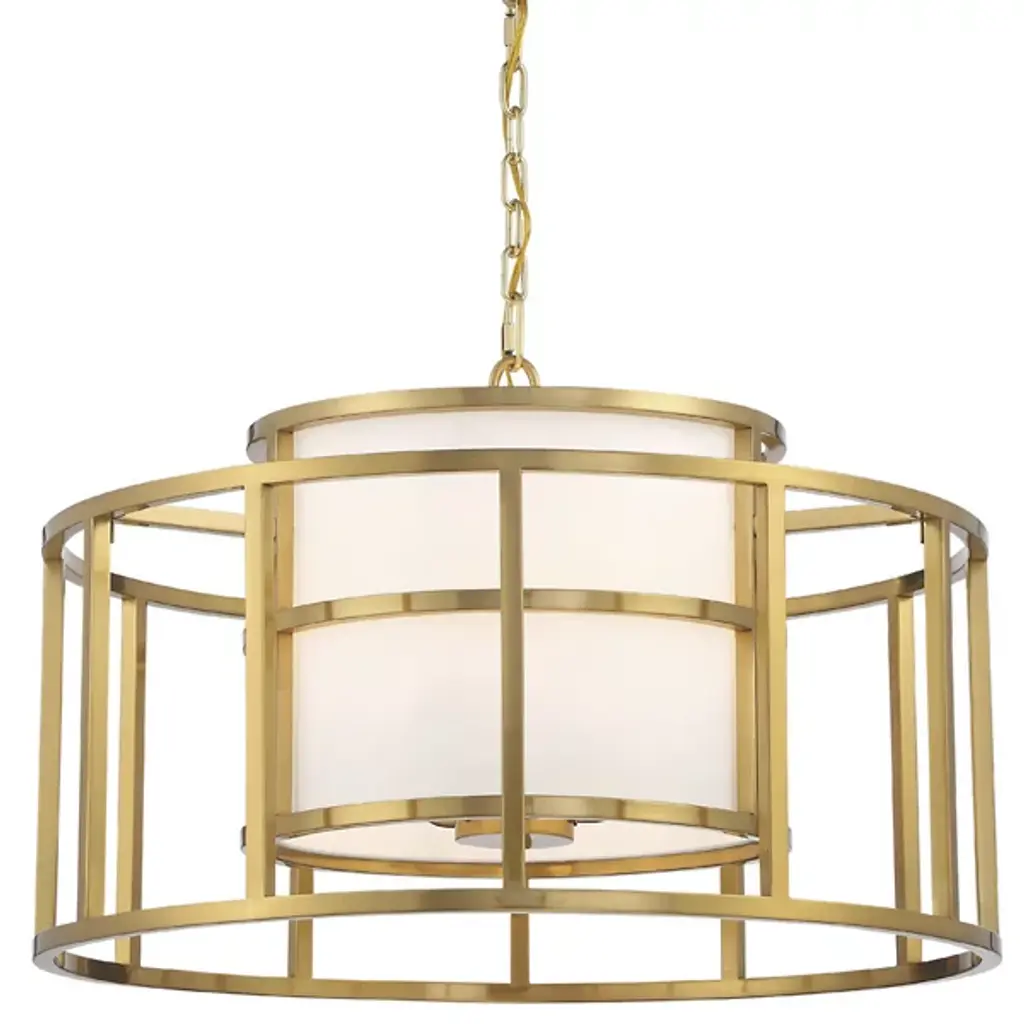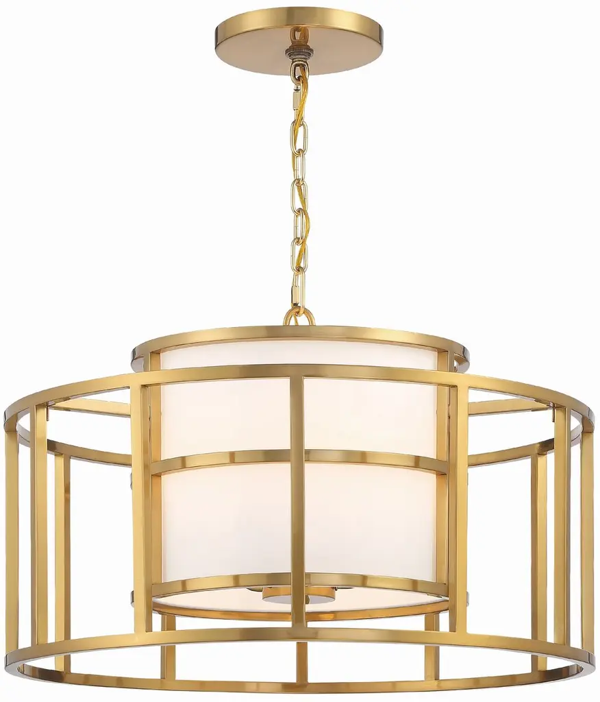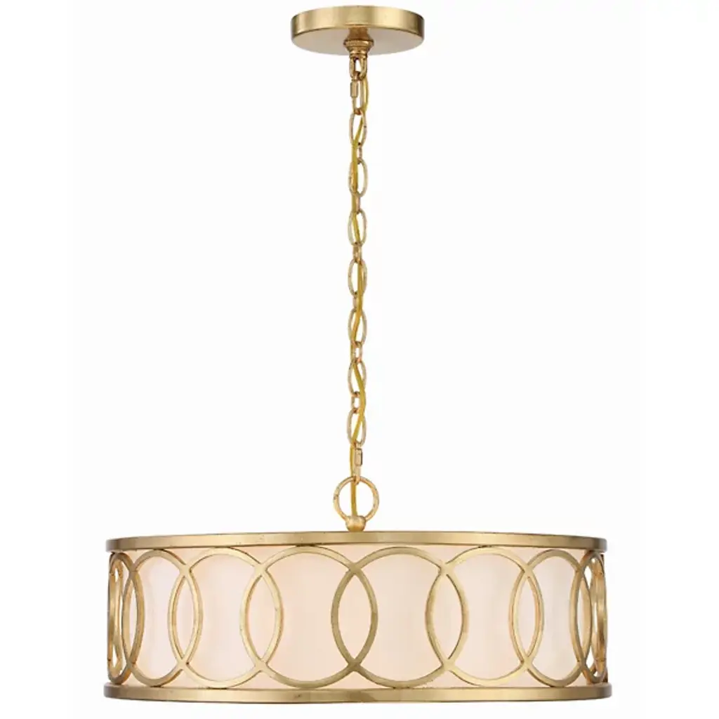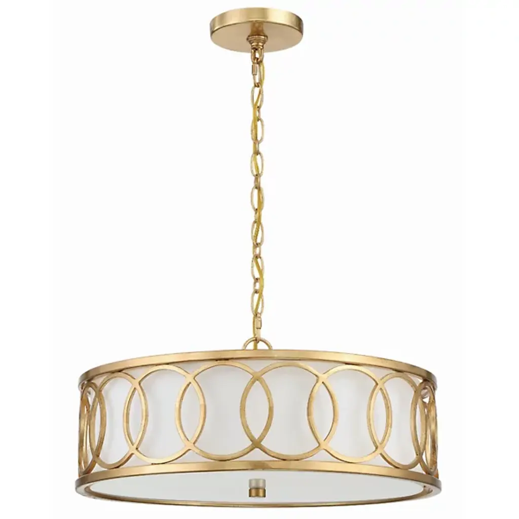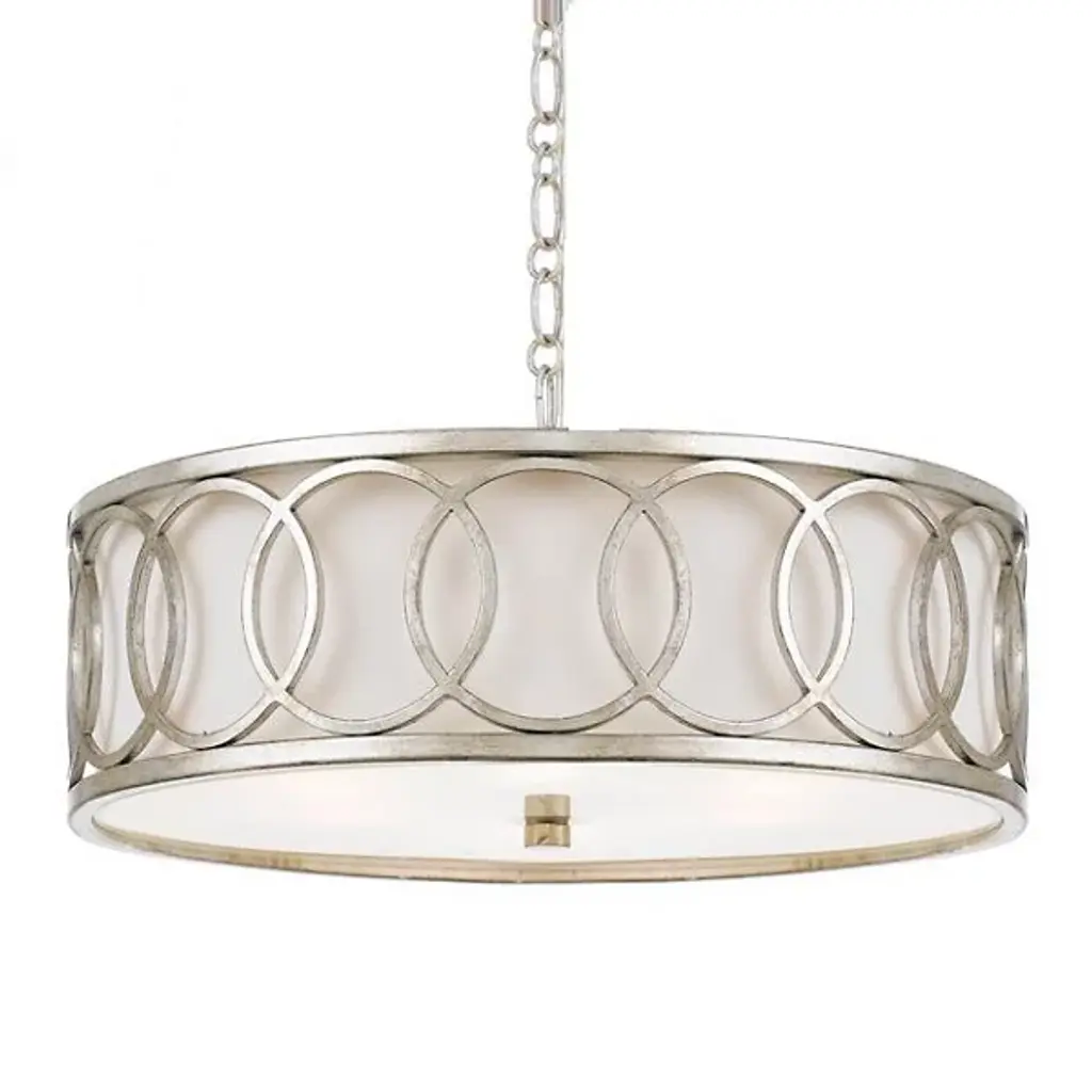 Elevate your dining or living area with the sophisticated Graham Drum Pendant by Crystorama, a charming and unique contemporary fixture designed by Libby Langdon. A round drum shade comprised of robust steel is adorned with a distinctive interlinking open circle framework creating an eye-catching motif. The fabric shade and bottom diffuser soften its warm, ambient light glowing from incandescent bulbs within and enhance the ornate pattern as a chic backdrop for that perfect space.