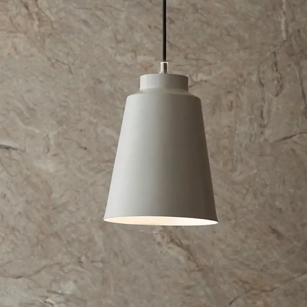 The Grain Barrel Pendant from Ravenhill Studio embraces a simple shape with a visually lightweight design, highlighting the beauty of craftsmanship. Initially noted as a byproduct of metal spinning, the subtle wood grain markings inspired a unique fabrication process. Custom molds, crafted from sandblasted maple boards, imprint natural wood grain patterns onto aluminum shades as they spin on a lathe. This technique ensures that each run of 25 shades carries a fresh and evolving texture, celebrating the intersection of traditional woodworking and modern metalwork.