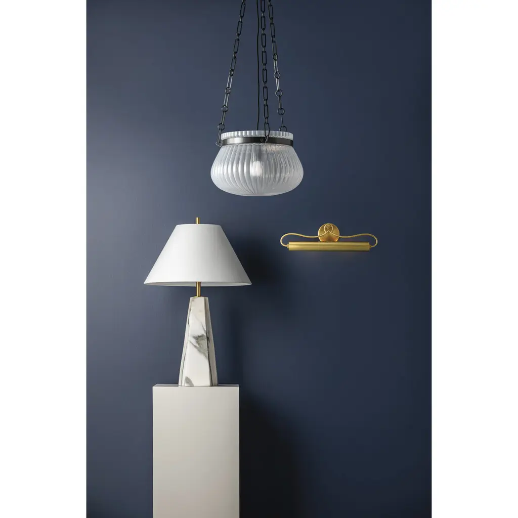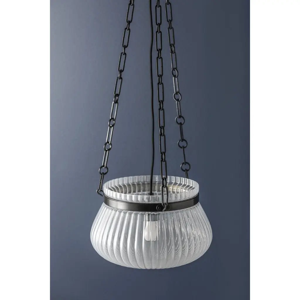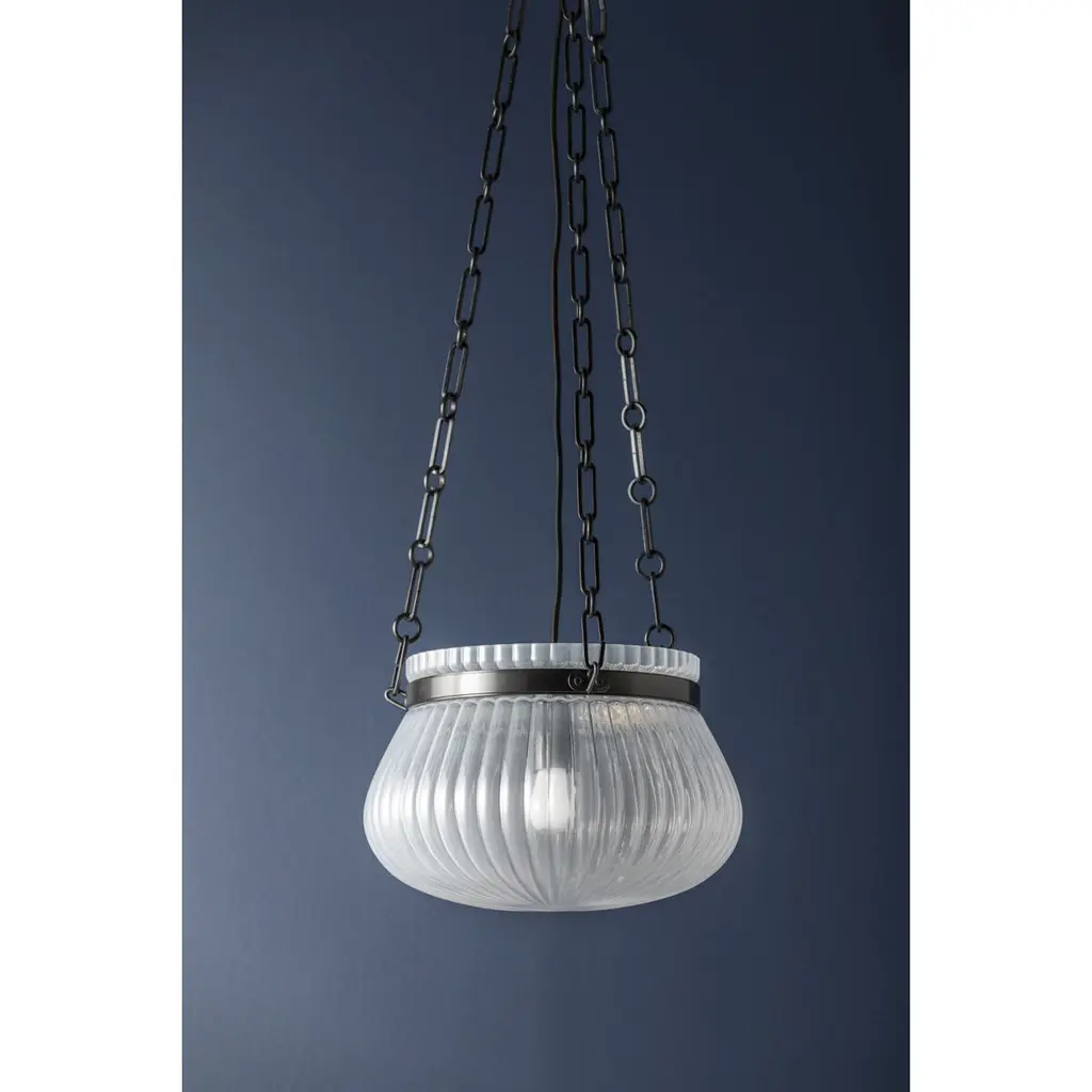 Featuring an exquisite Foschia glass pendant, Granby creates a captivating focal pointoverhead. Embodying a retro feel, its generously sized upturned bowl structure, crafted fromribbed glass, illuminates a wide area. The supporting chain is available in two sizes and twoclassic finishes; Aged Brass and Old Bronze.