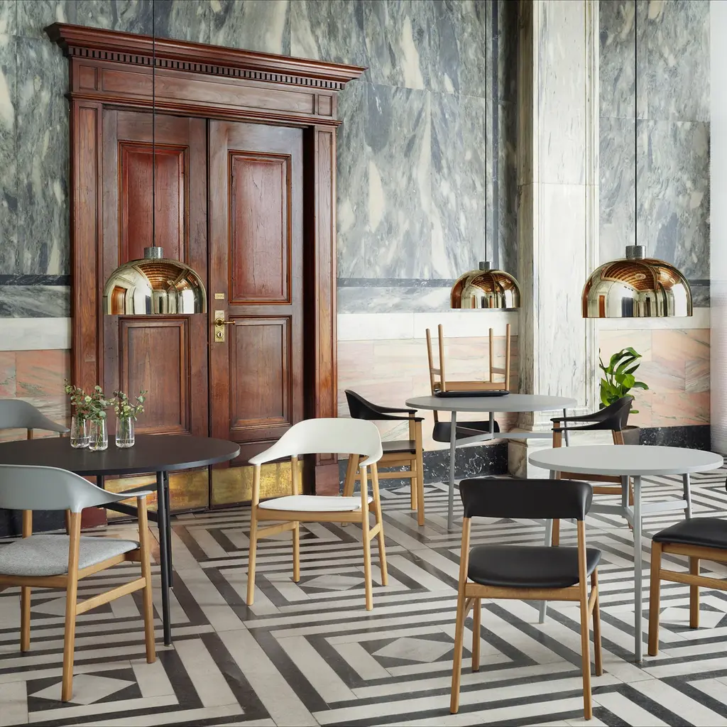 Rich granite is paired with polished metal in this standout pendant with a rounded shade inspired by Copenhagen's iconic street lights. The unexpected juxtaposition of materials in Grant adds visual interest and an eclectic vibe to Simon Legald's spare design. And both sizes in the series have a replaceable LED light source with a dispersion lens—which means the pendants can be hung high or low without any blinding glare.