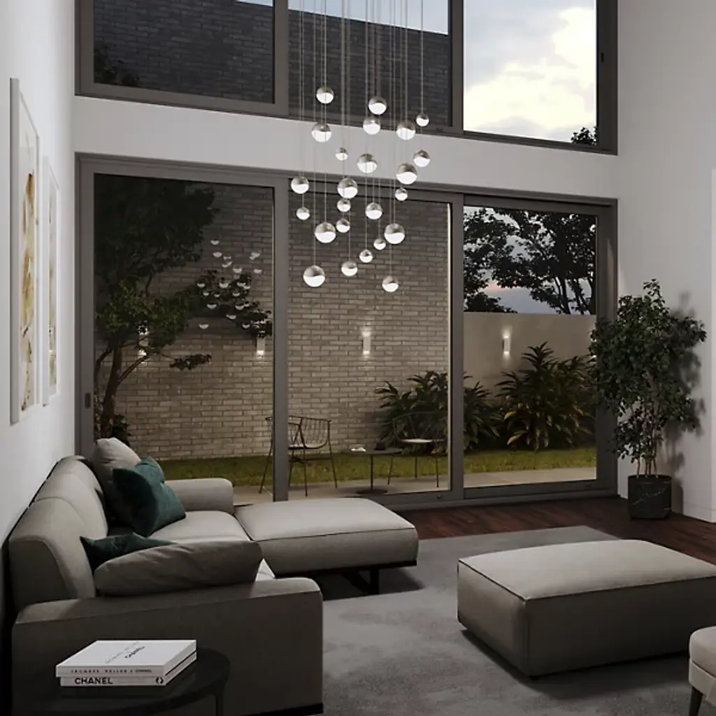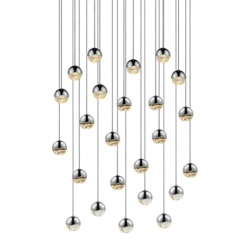 Like stars gathered from the constellations above and wrought together for a spectacular visual sensation, the SONNEMAN Lighting Grapes LED 24-Light Round Multipoint Pendant brings a celestial aura down to Earth. Seen from the middle or above, the crystal appears clear with a subtle luminance. Moving below, the crystal facets become increasingly apparent, refracting the light into a dazzling radiance. Each globe is capped with a metal infinity wave and attached to a 10’ adjustable cable cord.