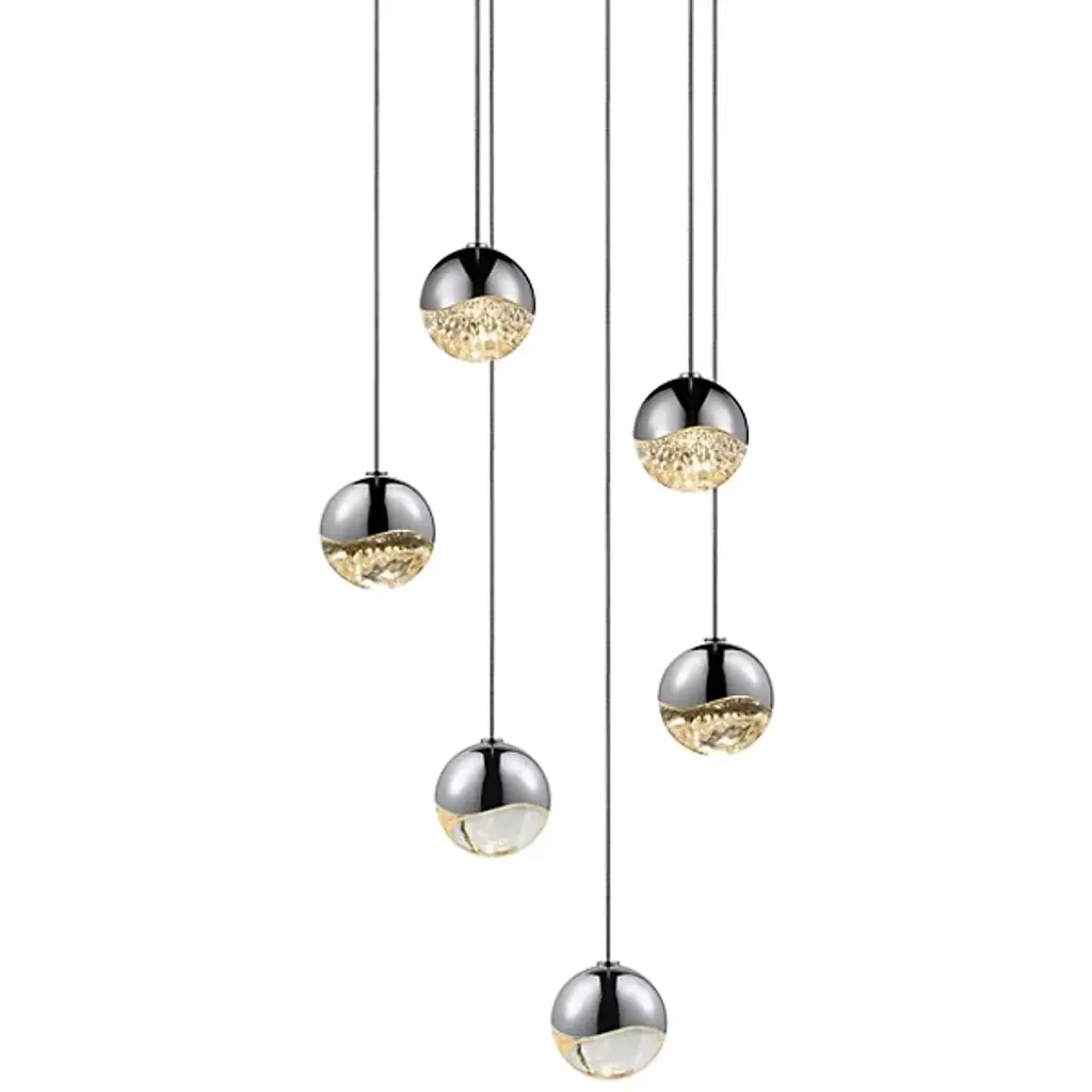 The SONNEMAN Lighting Grapes LED 6-Light Round Multipoint Pendant brings a celestial aura to your interior. As each globe features a faceted interior that projects beautiful light refraction when lit, the Grapes LED 6-Light Round Multipoint Pendant casts ample illumination for spaces both near and far. Seen from the center, the crystal appears clear with a slight luminance. Moving down, the crystal facets become more apparent, refracting the light into a stunning radiance. Each globe is capped with a metal infinity wave and attached to a 10’ adjustable cable cord.