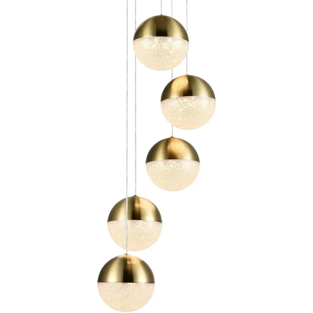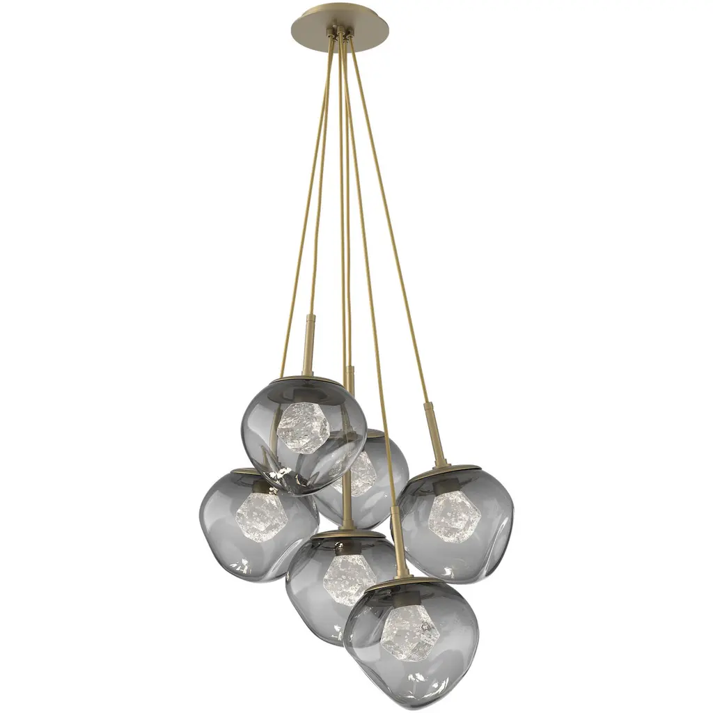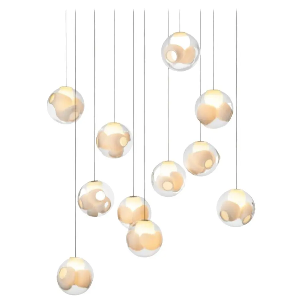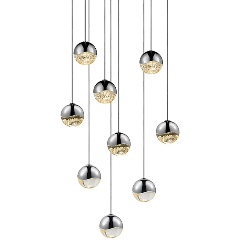 Grapes are luminous LED spheres in multiple sizes, arrayed in precise or random patterns, in clusters, or as single points of light. Seen from the middle or above, the crystal appears clear with a subtle luminance. Moving below, the crystal facets become increasingly apparent, refracting the light into a dazzling radiance. Each pendant has a 10' field adjustable cord to fit any space or design aesthetic. Features