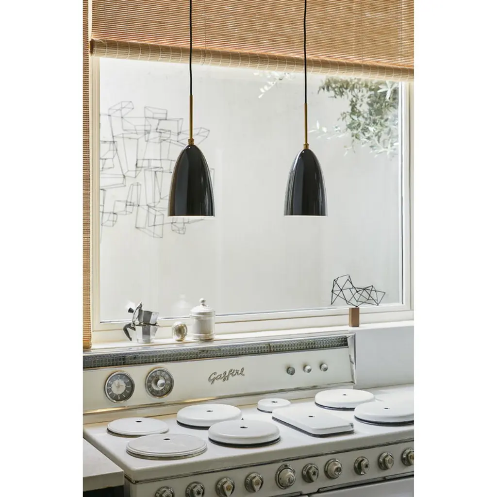 GUBI's Gräshoppa pendant is based on a luminaire designed by Greta Magnusson. The original Gräshoppa was first introduced as a floor lamp in 1947 and reissued in 2011. The Gräshoppa ceiling lamp features the same timelessly beautiful bell-like shade as the floor lamp, made of polished steel. Brass details complete the pendant's luxurious look. The beautiful ceiling light is ideal for a home kitchen or a dining area and looks great in public spaces such as restaurants, hotel lobbies or conference rooms as well.