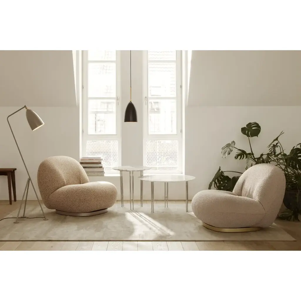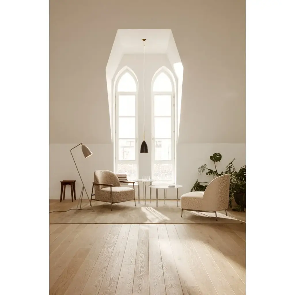 The Gräshoppa shade by Greta Grossman is fixed with a brass tube and brass fittings on the top. The powder-coated shade is available in 4 colors: matt white, anthracite gray, jet black and blue-gray.