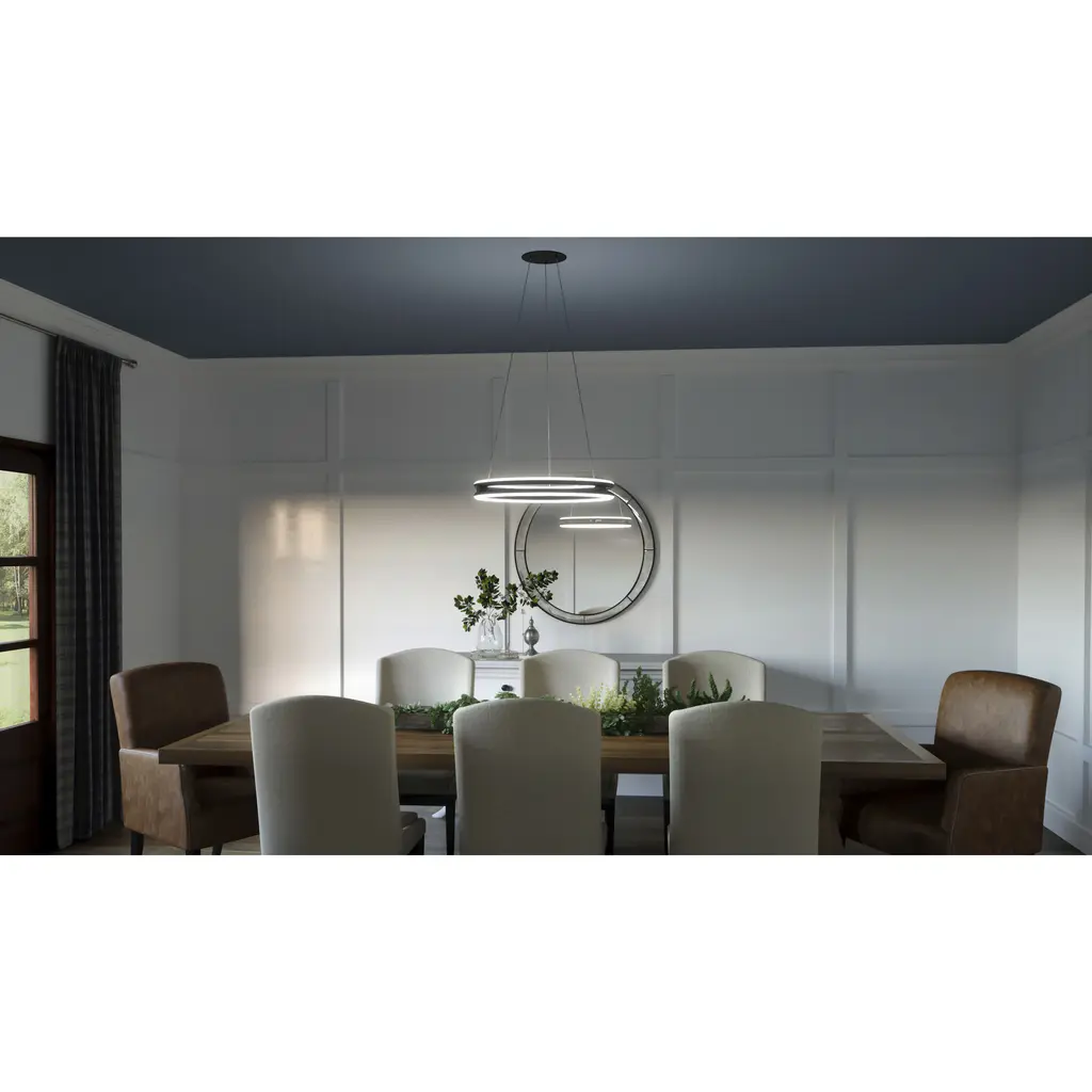 Clean and contemporary. A ring of glowing light defines the Graves chandelier, featuring a graphic, industrial-inspired palette of matte black and aluminum elements. Crafted completely from steel, Graves illuminates the stark beauty of true industrial style.