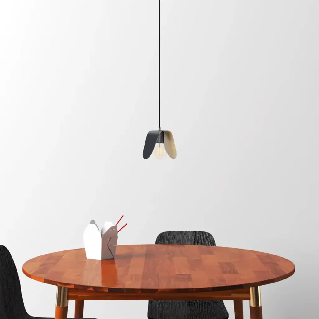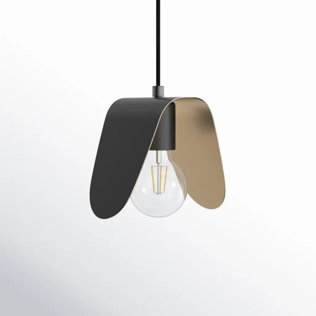 The mini pendant is made of black metal with a black exterior and gold interior shade. The curved shade is suspended from a round black metal canopy with a black textile adjustable hanging cord.