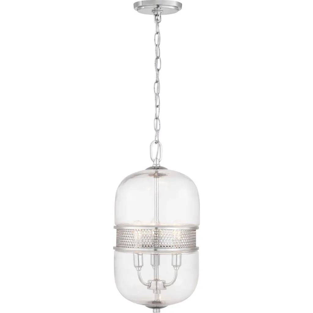 Gregory’s capsule silhouette showcases an interior candelabra cluster. An interlocking hexagonal design gracefully adorns the middle of the glass to add visual interest. This three-light pendant is in a beautiful Chrome finish. Flush with personality, the Gregory Collection pendant provides a unique design style suitable for a variety of interiors, including Modern, Farmhouse, Urban Industrial and Luxe.