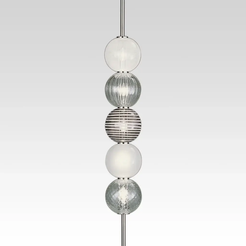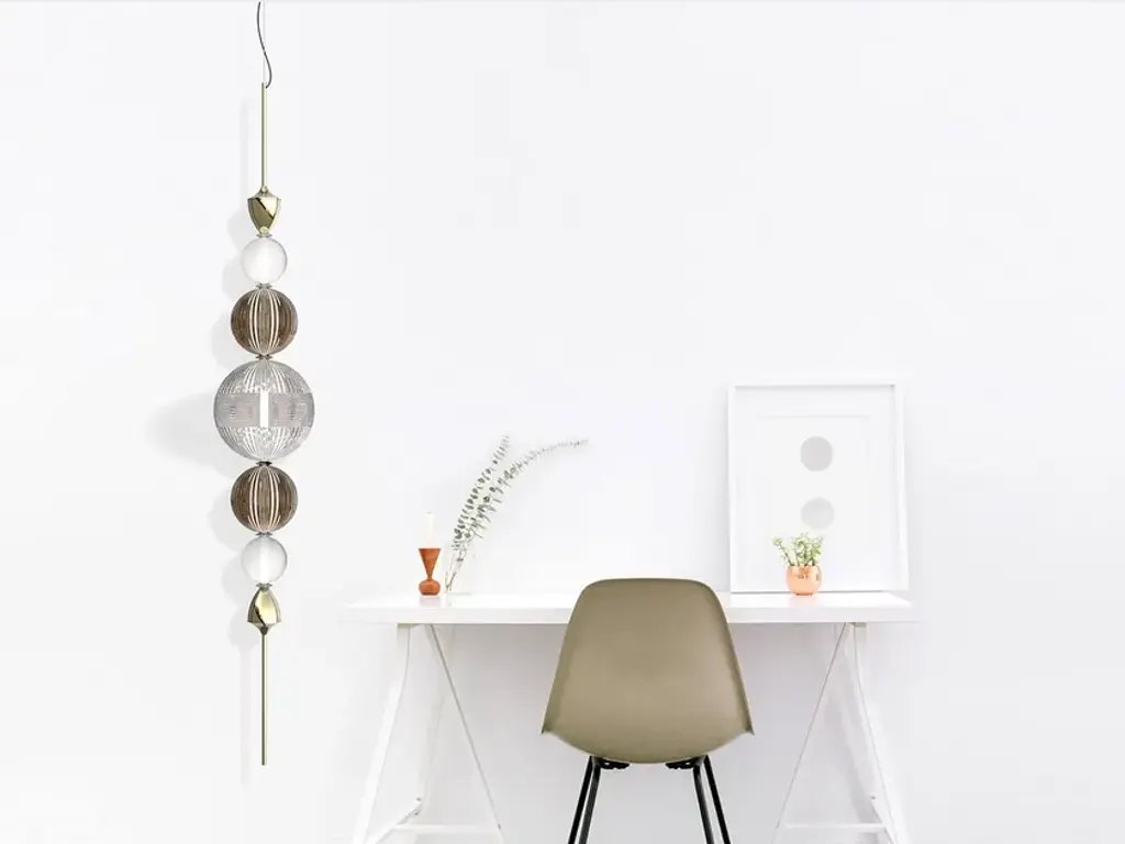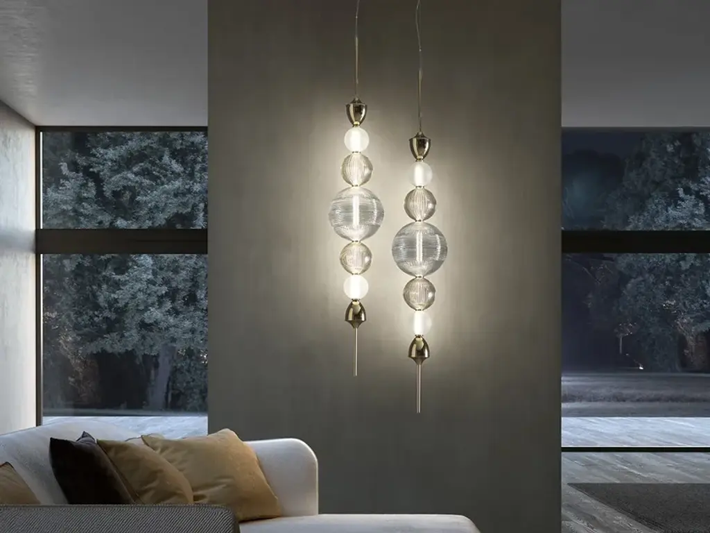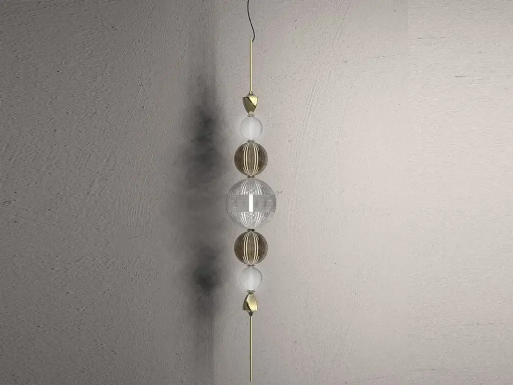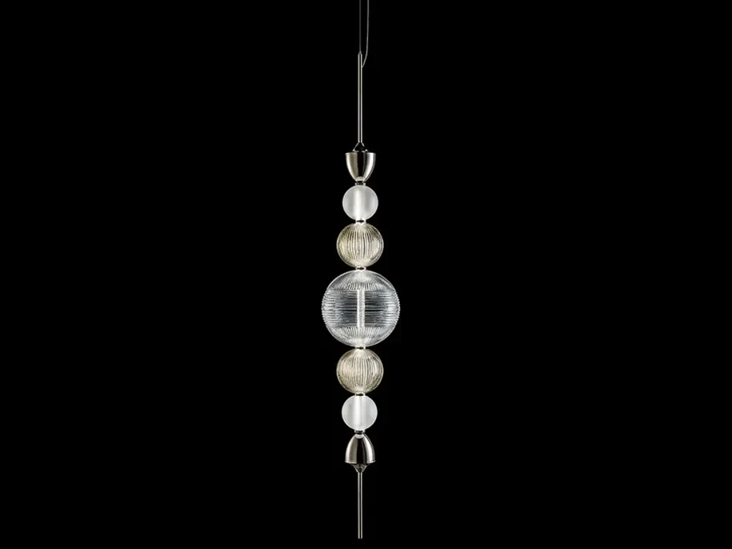 Greta is a vertical pendant lamp made into a jewel by the refined game of transparencies and glass processing. The LED, positioned on the longitudinal metal bar, illuminates the carved crystal elements characterized by different textures and colors. Thanks to this alternation of materials, when the light is projected from the bar, is created an impalpable game of light, giving a precise character to the space. The metal frame is available with shiny nickel, while the crystal can be transparent, teak or satin.Electrical and technical characteristicsLED: 24 wLumen: 870Temperature: 3000 KCRI>80Driver. included, not dimmable. On request dimmable with DALI or Casambi BluetoothVoltage: 230 VEnergy class: A+IP20Certifications: CE/EAC