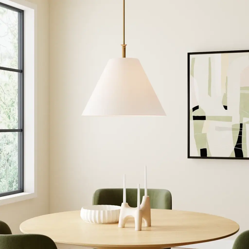 Inspired by traditional lighting styles, Greta complements its slim, contemporary silhouette with timeless details and classic finishes. A tapered, off-white linen shade softly diffuses light, filling your space with a warm ambiance.