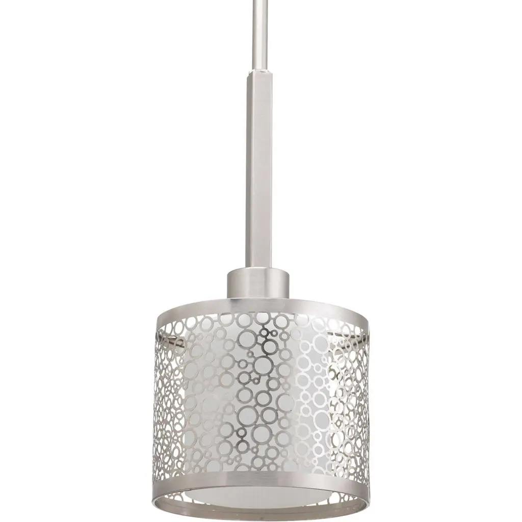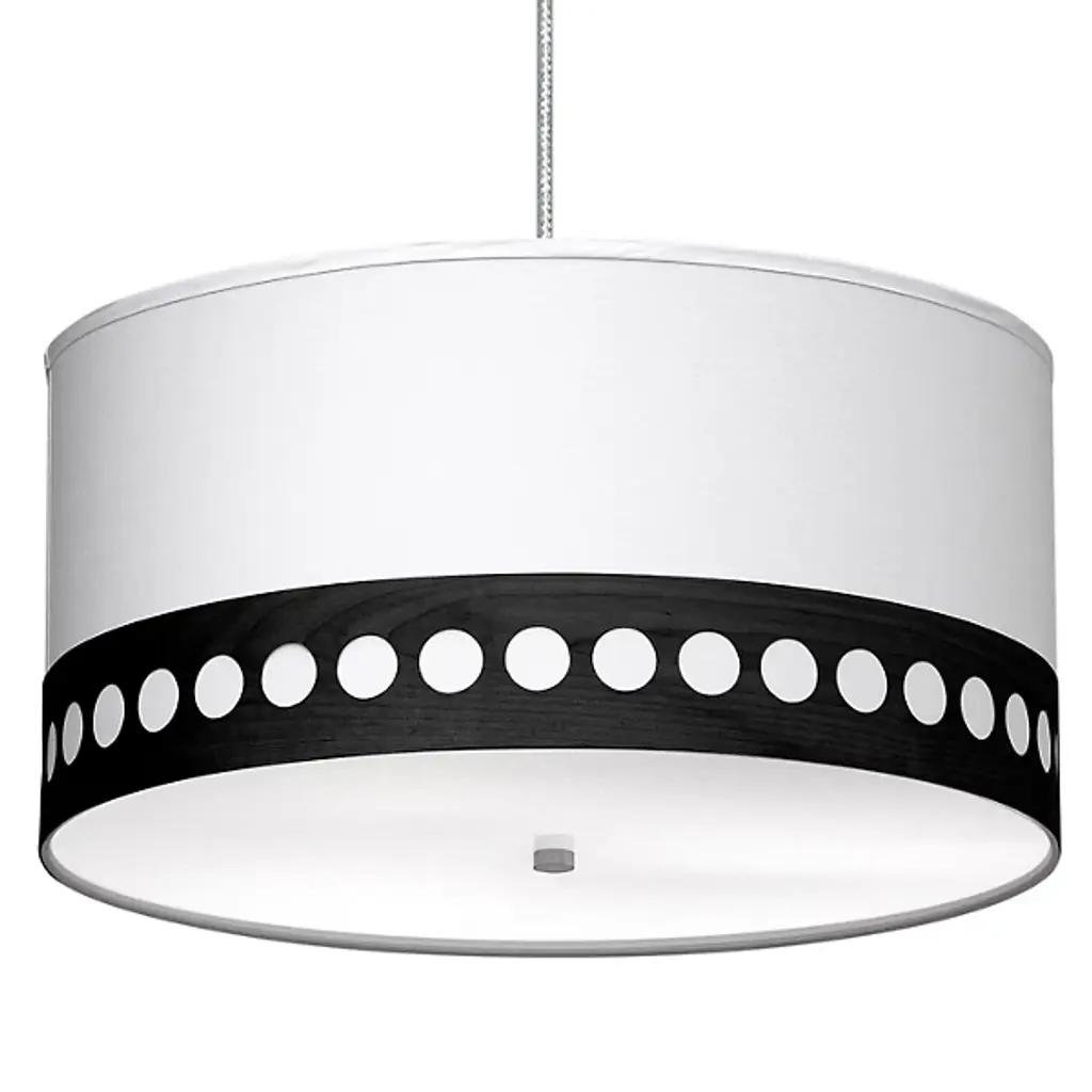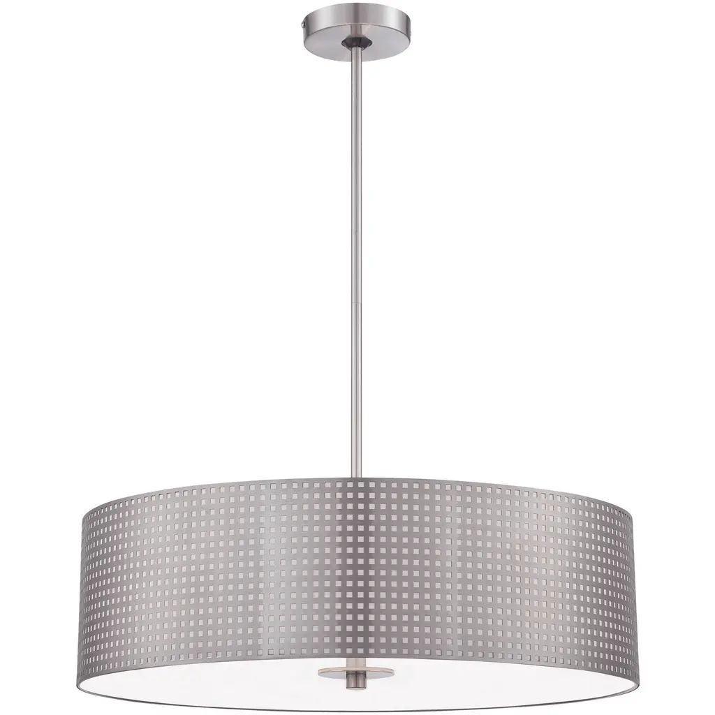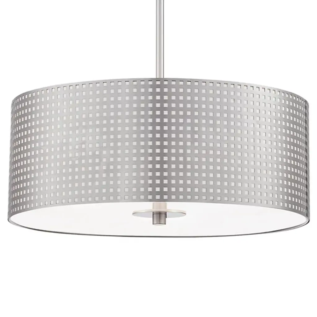 The Grid Drum Pendant by George Kovacs brings a clean, contemporary presence to your home décor, featuring a classically tailored Steel drum shade that’s been perforated in a precise grid pattern. This small openings allow light to shine through in narrow beams, giving the entire fixture a surreal, sparkling quality. The bottom of the shade is capped with an Etched glass diffuser (with center finial) which provides a wash of ambient lighting over an area or surface of interest.