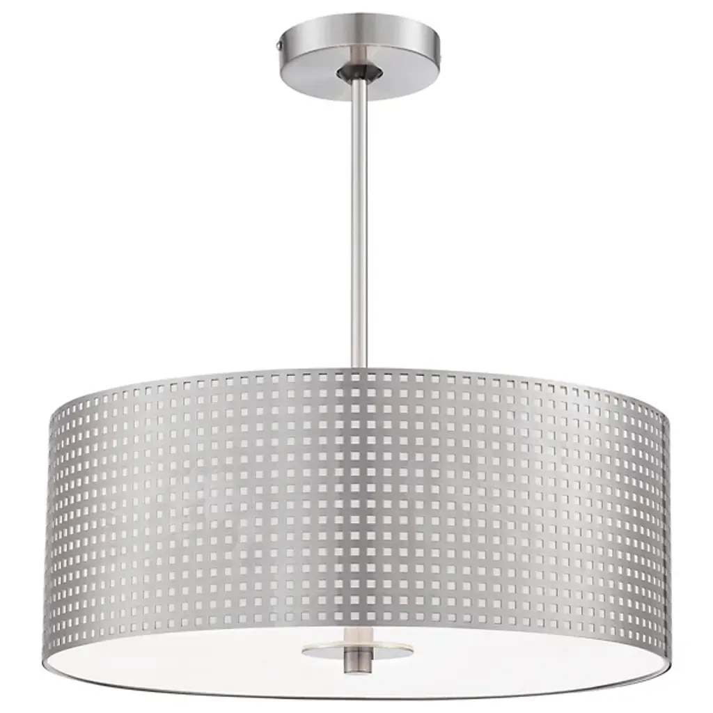 The Grid Drum Pendant by George Kovacs brings a clean, contemporary presence to your home décor, featuring a classically tailored Steel drum shade that’s been perforated in a precise grid pattern. This small openings allow light to shine through in narrow beams, giving the entire fixture a surreal, sparkling quality. The bottom of the shade is capped with an Etched glass diffuser (with center finial) which provides a wash of ambient lighting over an area or surface of interest.