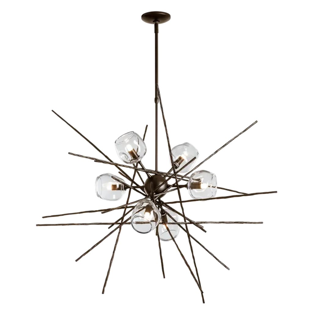 The Griffin Starburst Pendant features six unique, "thumbprint" glass shades. The starburst design is achieved with handcrafted, hammered steel rods created by Vermont artisans to look like the natural tree bark of intersecting twigs.The organic shaped glass is available in clear and cool grey.