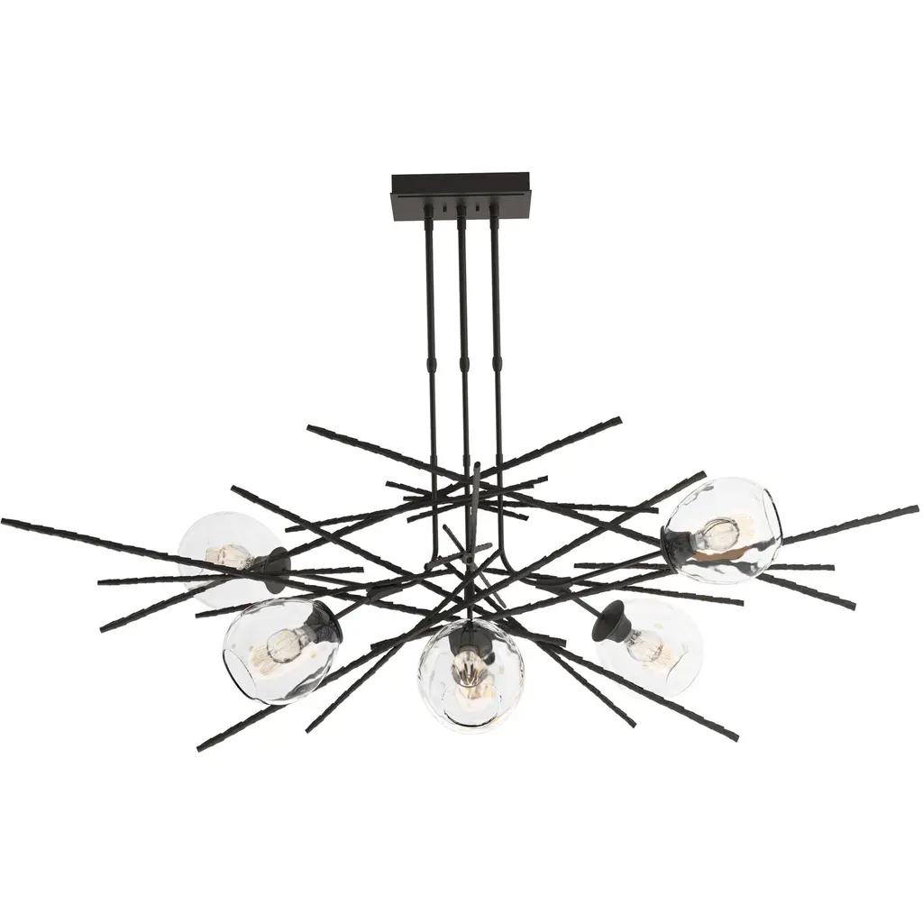 This dramatic pendant features a newly-developed technique of forging bark-like textural elements in steel. The result is the Griffin—a stunning arrangement of structure that balances the organic glass forms.