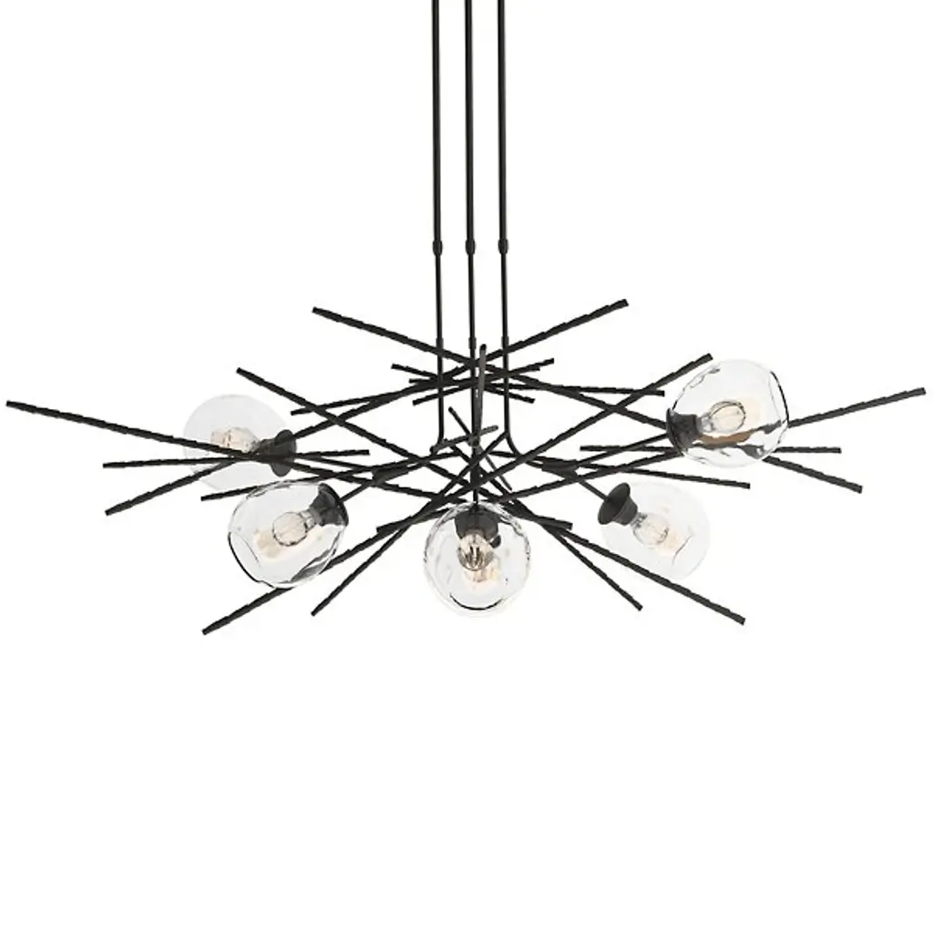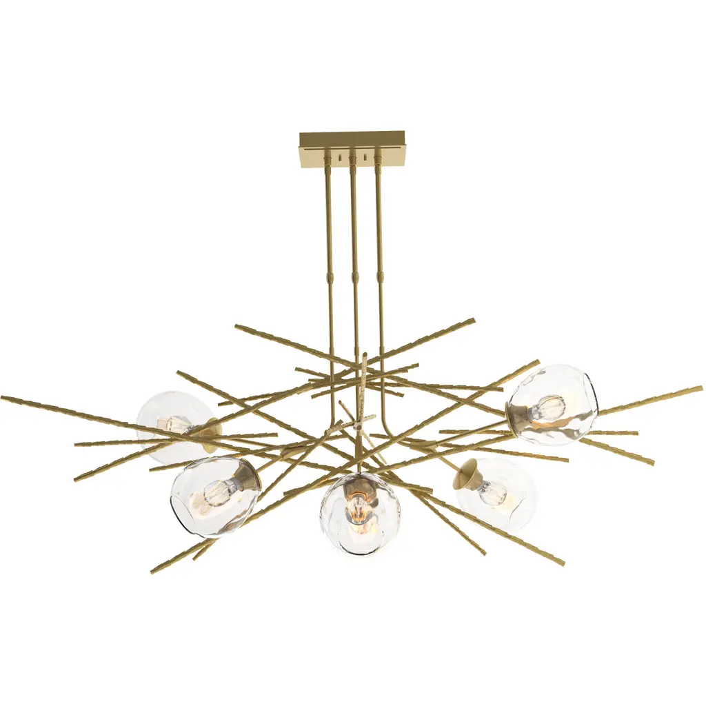 This dramatic pendant features a newly-developed technique of forging bark-like textural elements in steel. The result is the Griffin—a stunning arrangement of structure that balances the organic glass forms.