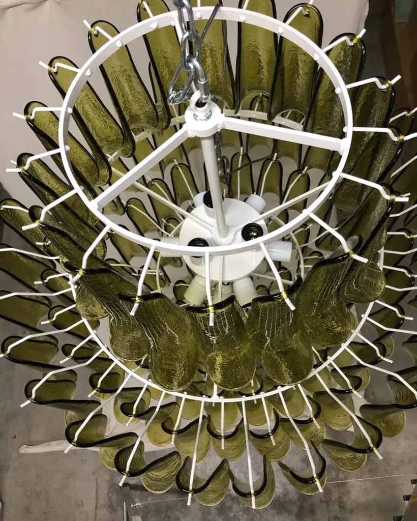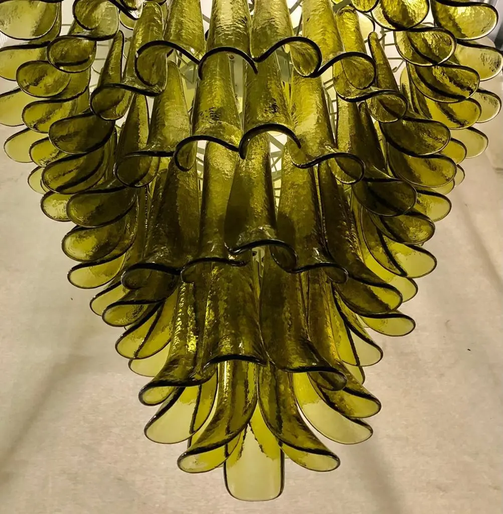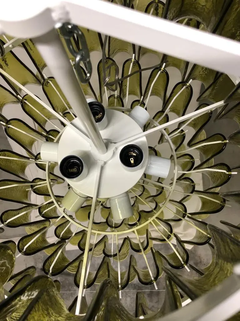 Extraordinary green color for this "Gruppo Luce" La Murrina chandelier, a green color with a unique transparency. Its green color is really guessed for a different and original chandelier from others. A beautiful stain of color above your ceiling will drive anyone crazy into your home.The chandelier has a round white metal structure. All around there are green colored Murano glass tiles. There are eight concentric circles, which widen more and more from the bottom up to the last circle at the top. Then again the last circle narrows to cover the hook on the ceiling, so as to be attached directly to the ceiling. There are twelve bulbs on multiple levels as you can see from the photos.Wear consistent with age and use. Each item offered by the HannauRoma warehouse is checked by our team of craftsmen. We guarantee a very high quality standard, ask our design specialists for detailed information.