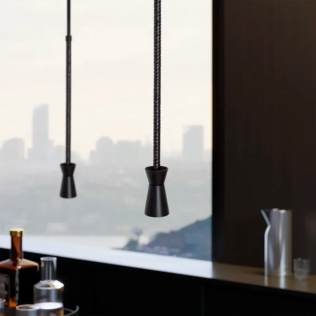 A lighting fixture of distinct minimalist inspiration, this pendant lamp incorporates an exquisite detail that lends it its characteristic sartorial charm. The structural stem is wrapped by braided dark-brown leather, hue chosen for an elegant chromatic coordination with the rest of the silk-effect black-lacquered structure. Cylindrical ceiling mount and conical shade complete the design.
