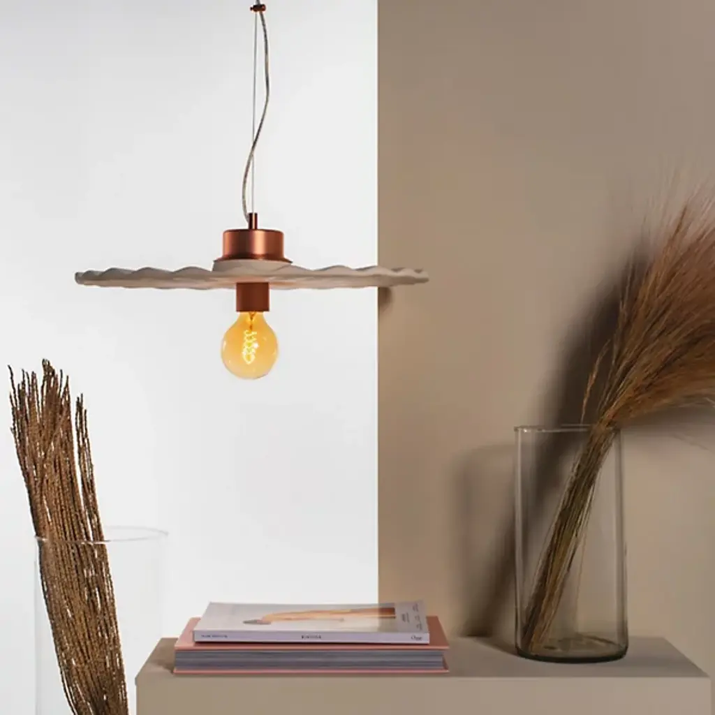 The Guanabara Pendant from Geo Contemporary stands out with its distinctive profile. A flat, circular shade with scalloped edges creates an unexpected profile, while the central exposed bulb adds a hint of industrial chic. This unique combination casts intriguing patterns on nearby surfaces, turning walls into canvases of light. This luminaire shines in areas calling for a bold statement piece, such as above a dining table or in a spacious foyer. Its playful form evokes the undulating coastline of Brazil, infusing spaces with a subtle coastal vibe.