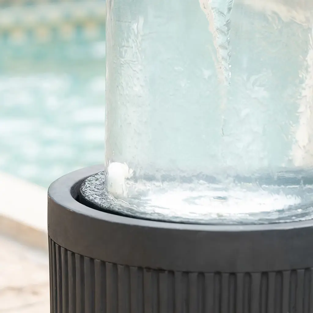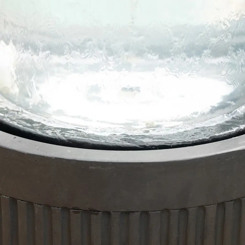 Elevate your outdoor ambiance with the 19.5" Black Ribbed Round Outdoor Fountain. This modern water feature, measuring 20" x 20" x 19.5", is perfect for compact spaces like patios and gardens. Its sleek black ribbed design and clear top create a sophisticated look, while the gentle water flow offers a calming auditory experience. The fountain's timeless aesthetic seamlessly integrates into any outdoor decor, providing a tranquil retreat in your own backyard.