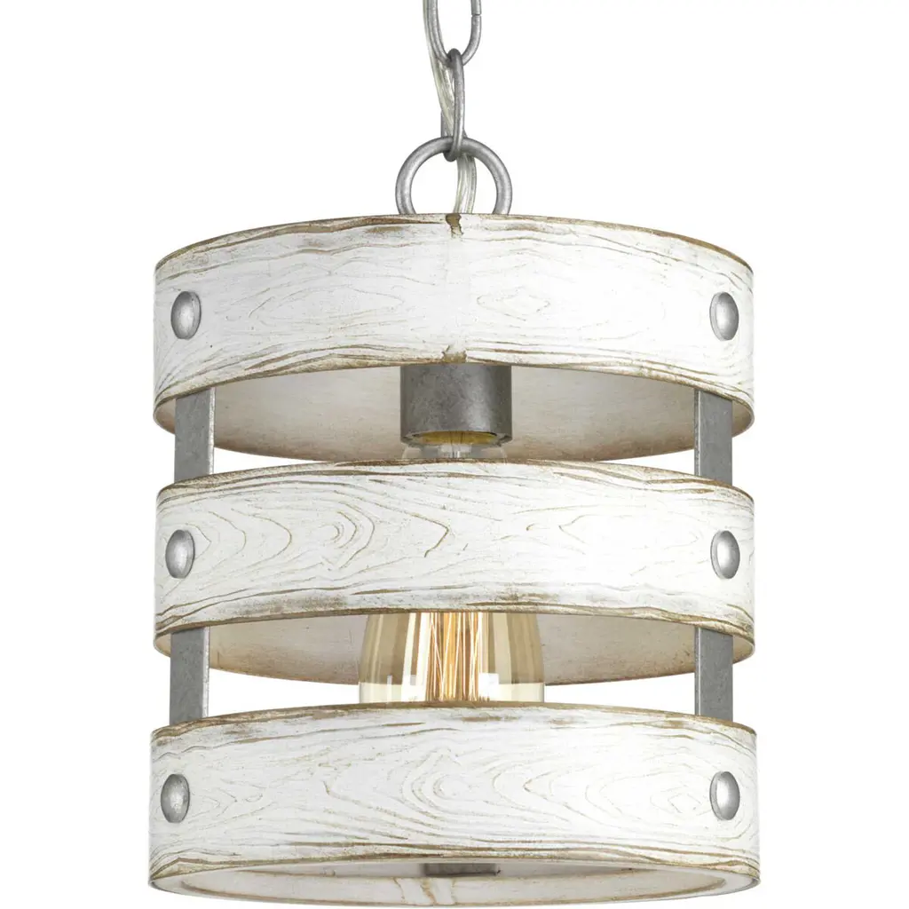 Three circular bands wrap together to create an open design in Gulliver. Hand painted to emulate weathered driftwood, the one-light mini-pendant's Graphite frame is accented by smooth knobs and encases exposed bulbs. The wood grained texture complements rustic farmhouse home decor.
