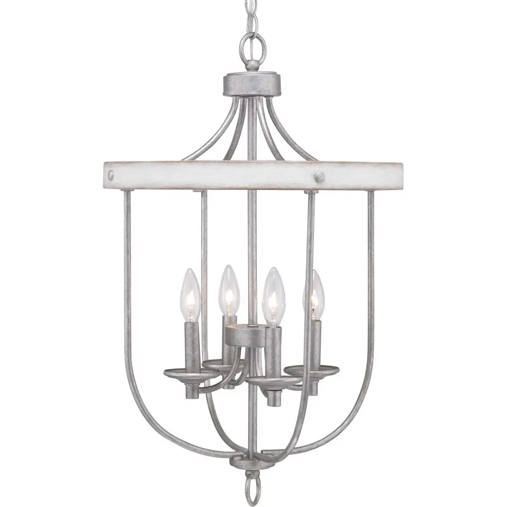 The four-light foyer in the Gulliver Collection features arching and delicate details that curve to create an airy design. Dual toned frame color combinations in a Graphite finish with weathered oak accents The hand painted wood grained texture complements Rustic and Modern Farmhouse home decor, as well as Urban Industrial and Coastal interior settings.