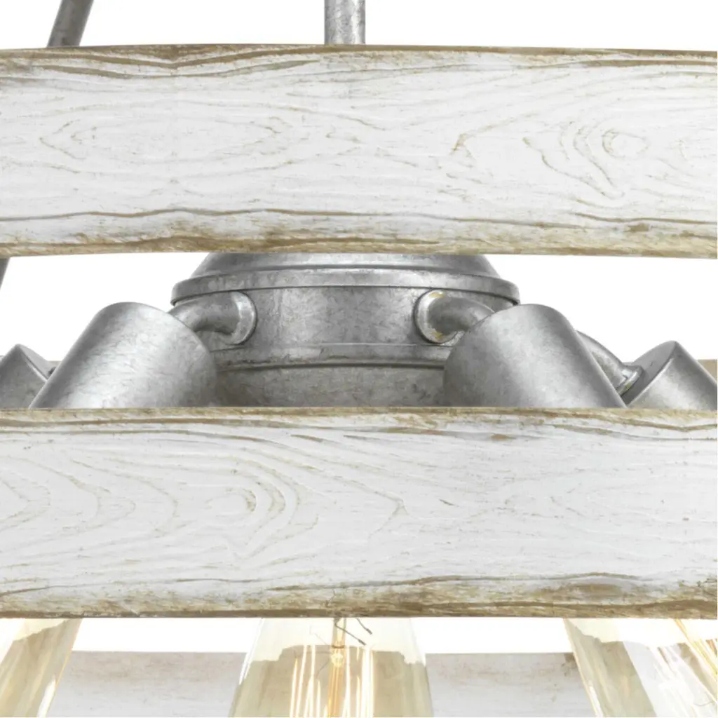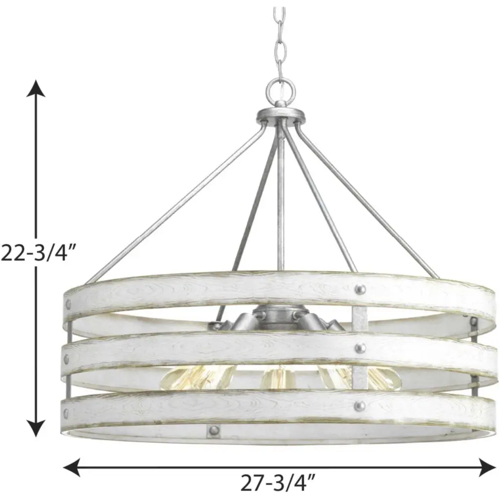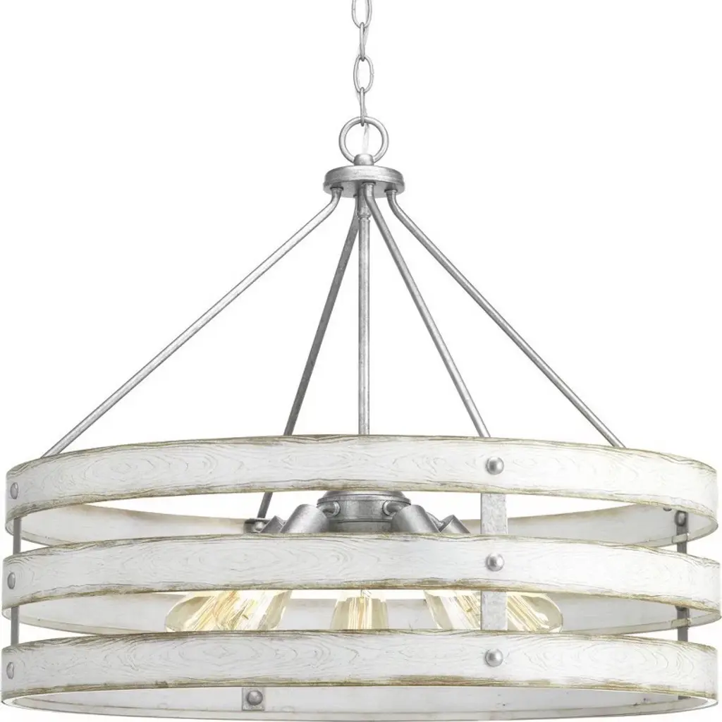 Three circular bands wrap together to create an open design for Gulliver five-light pendant. Dual toned frame color combinations of Galvanized with antique white accents. A hand painted wood grained texture complements Rustic and Modern Farmhouse home decor, as well as Urban Industrial and Coastal interior settings.