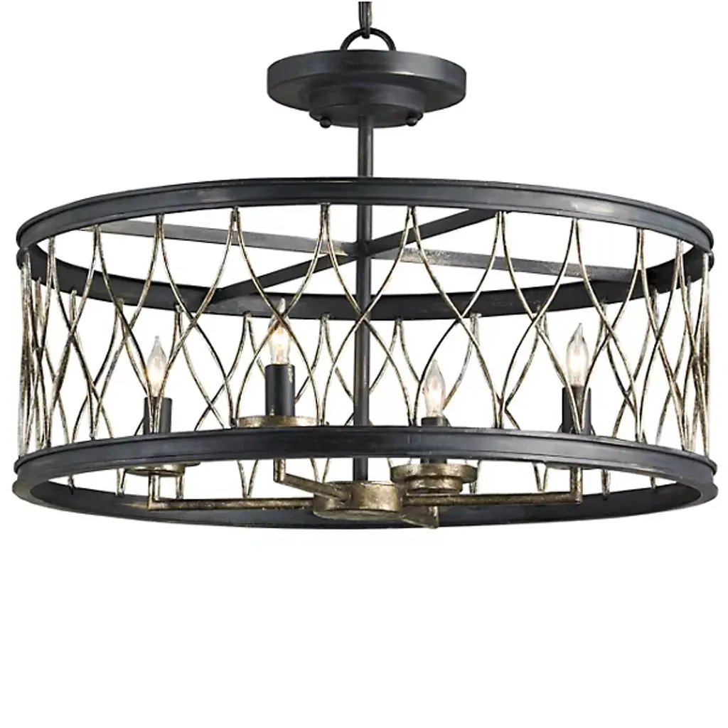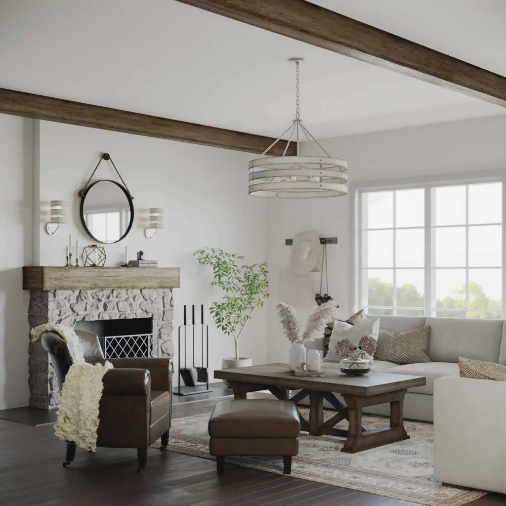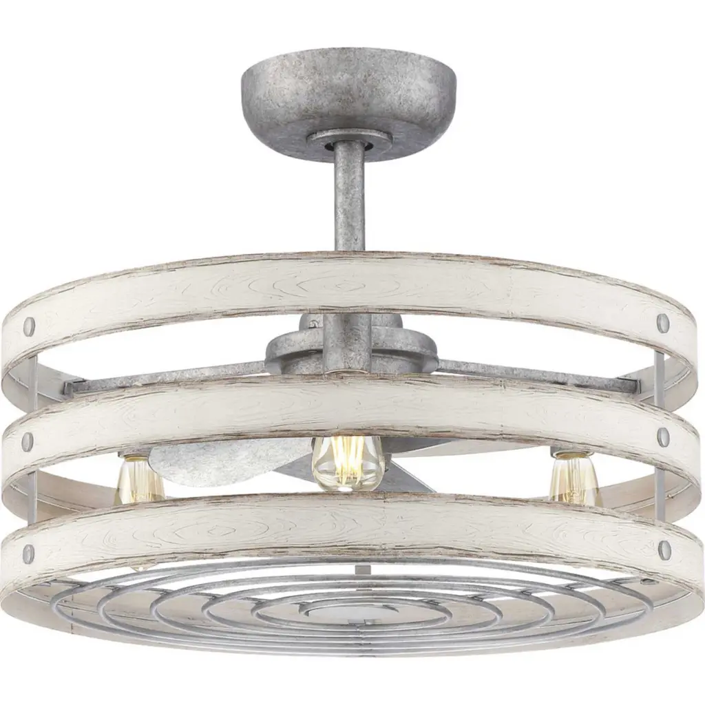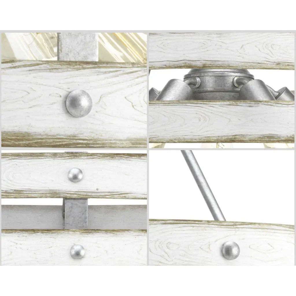 Three circular bands wrap together to create an open design for Gulliver five-light pendant. Dual toned frame color combinations of Galvanized with antique white accents. A hand painted wood grained texture complements Rustic and Modern Farmhouse home decor, as well as Urban Industrial and Coastal interior settings.