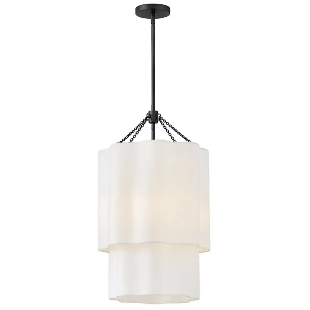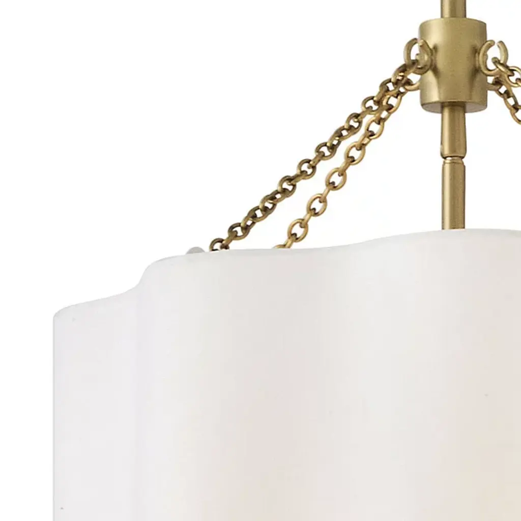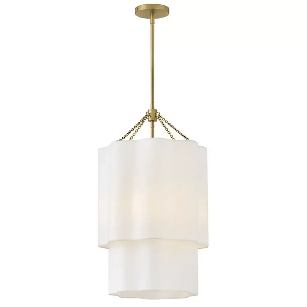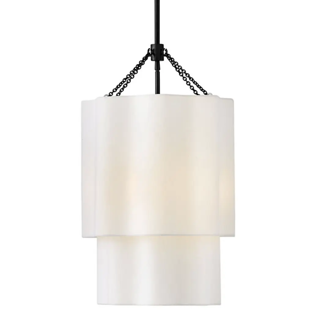 The Gwen Pendant from Hinkley uses a cylindrical scalloped shade to direct light both downward and outward for a steady glow. Fine metal chains support the layered linen shade, creating visual interest through the contrast between delicate suspension elements and the substantial fabric form. This pendant transforms dining tables, kitchen islands, or reading nooks with its gentle yet ample light output. The adjustable stem system allows for perfect height positioning to suit different ceiling heights and room proportions. This pendant brings quiet sophistication to spaces where flattering, ambient light is desired.