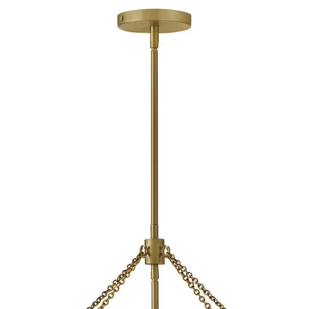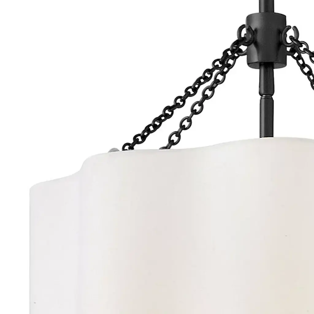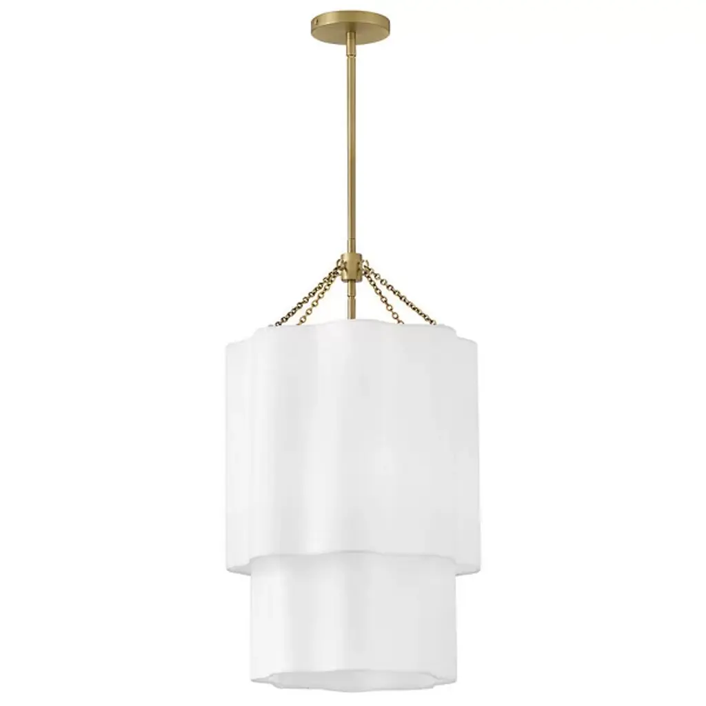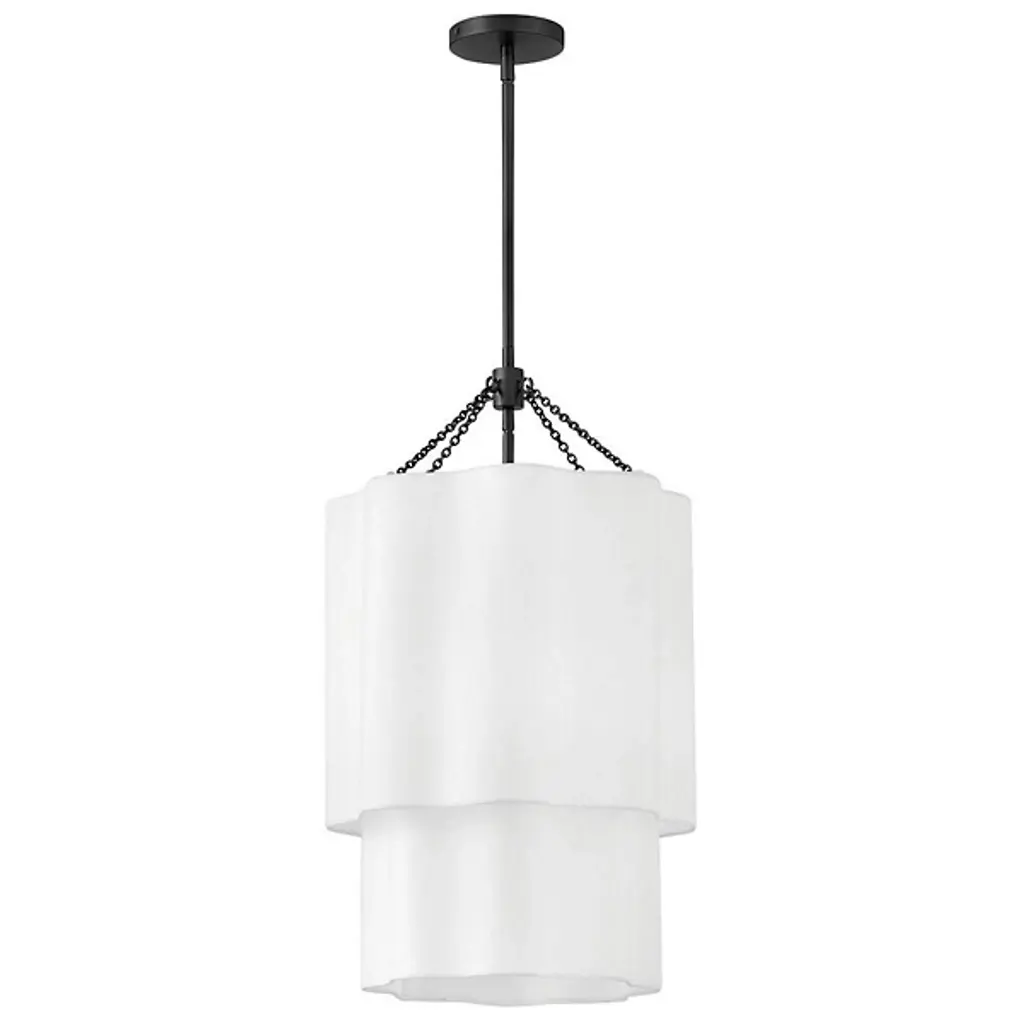 The Gwen Pendant from Hinkley uses a cylindrical scalloped shade to direct light both downward and outward for a steady glow. Fine metal chains support the layered linen shade, creating visual interest through the contrast between delicate suspension elements and the substantial fabric form. This pendant transforms dining tables, kitchen islands, or reading nooks with its gentle yet ample light output. The adjustable stem system allows for perfect height positioning to suit different ceiling heights and room proportions. This pendant brings quiet sophistication to spaces where flattering, ambient light is desired.