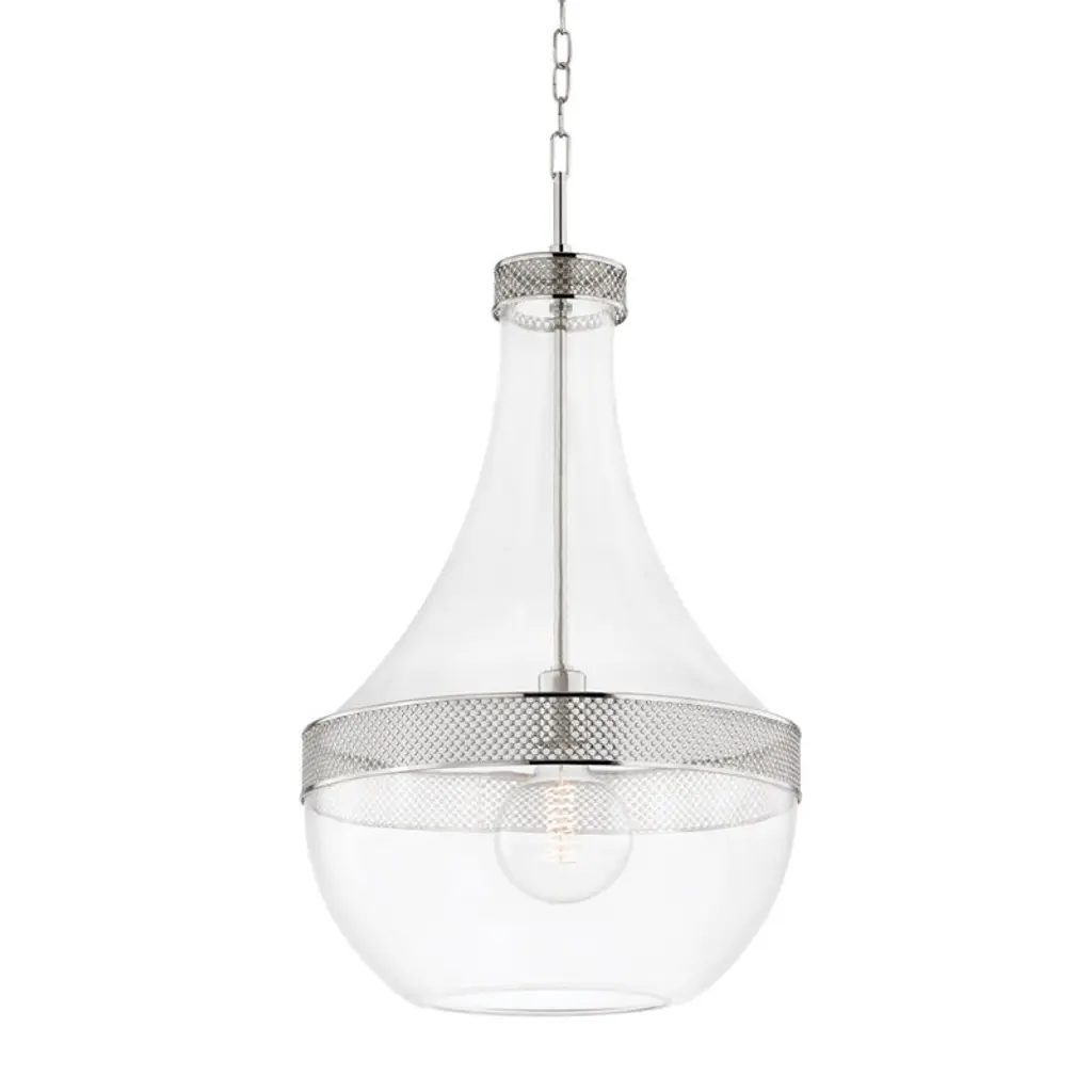 Like a wish come true, an intricately perforated metal band wraps around the middle and top of Hagen's genie bottle shaped shade. A single globe filament bulb is magically suspended inside the thick glass of this statement-making pendant. Suspended from a chain that allows for over four-feet of height adjustment and available in three different sizes, this fine fixture works with both high and low ceilings and large and small spaces. Choose from three finishes: Aged Brass, Old Bronze and Polished Nickel.