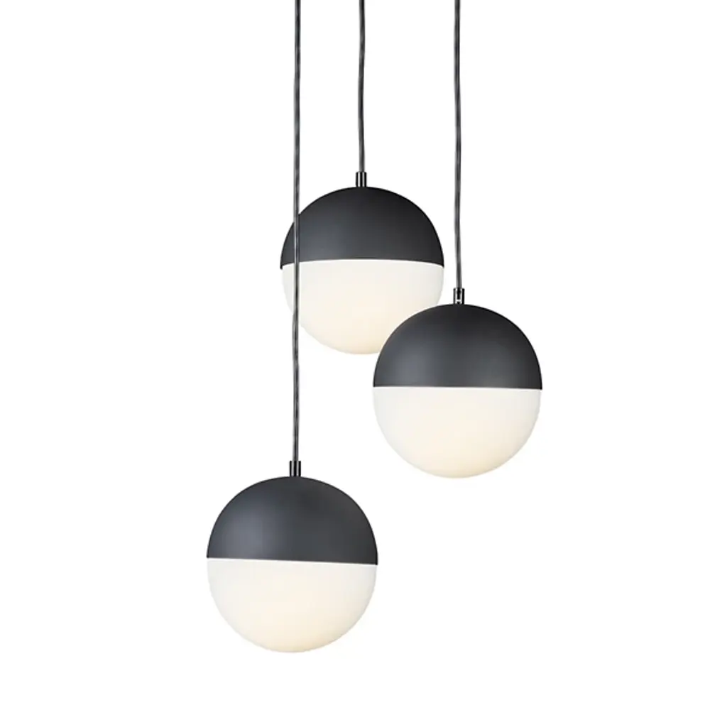 The Half Moon Multi-Light Pendant by ET2 Lighting makes an elegant focal point within any modern décor. This stylish fixture features a series of globe-shaped shades hanging from a single circular canopy, each one suspended at staggered lengths to create a striking visual display. Smooth steel caps adorn the top of each globe, while their satin white glass lower half glow warmly with the light of the integrated LED modules inside.